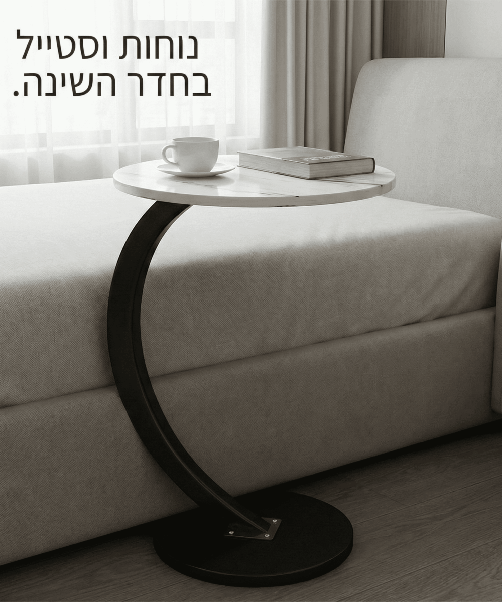 שולחן צד C עגול לספה – נכנס מתחת לספה/מיטה – דמוי שיש לבן בסיס שחור