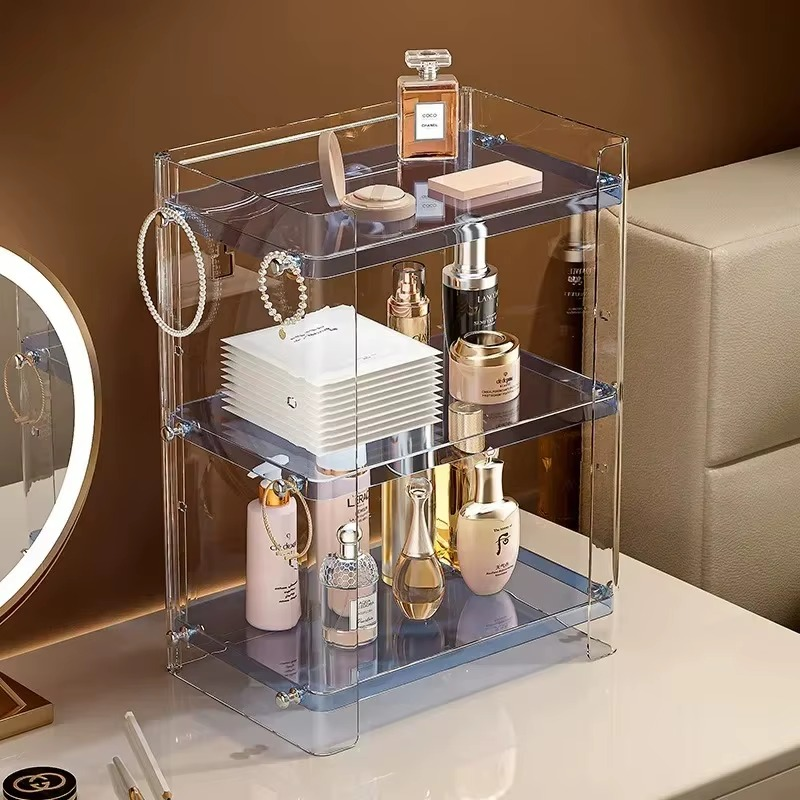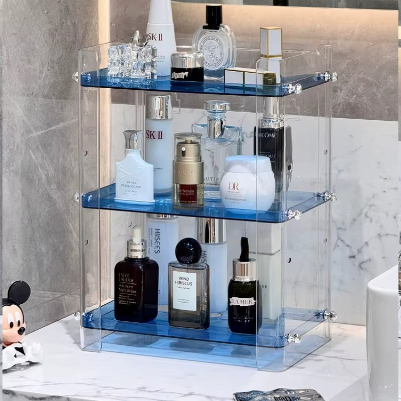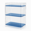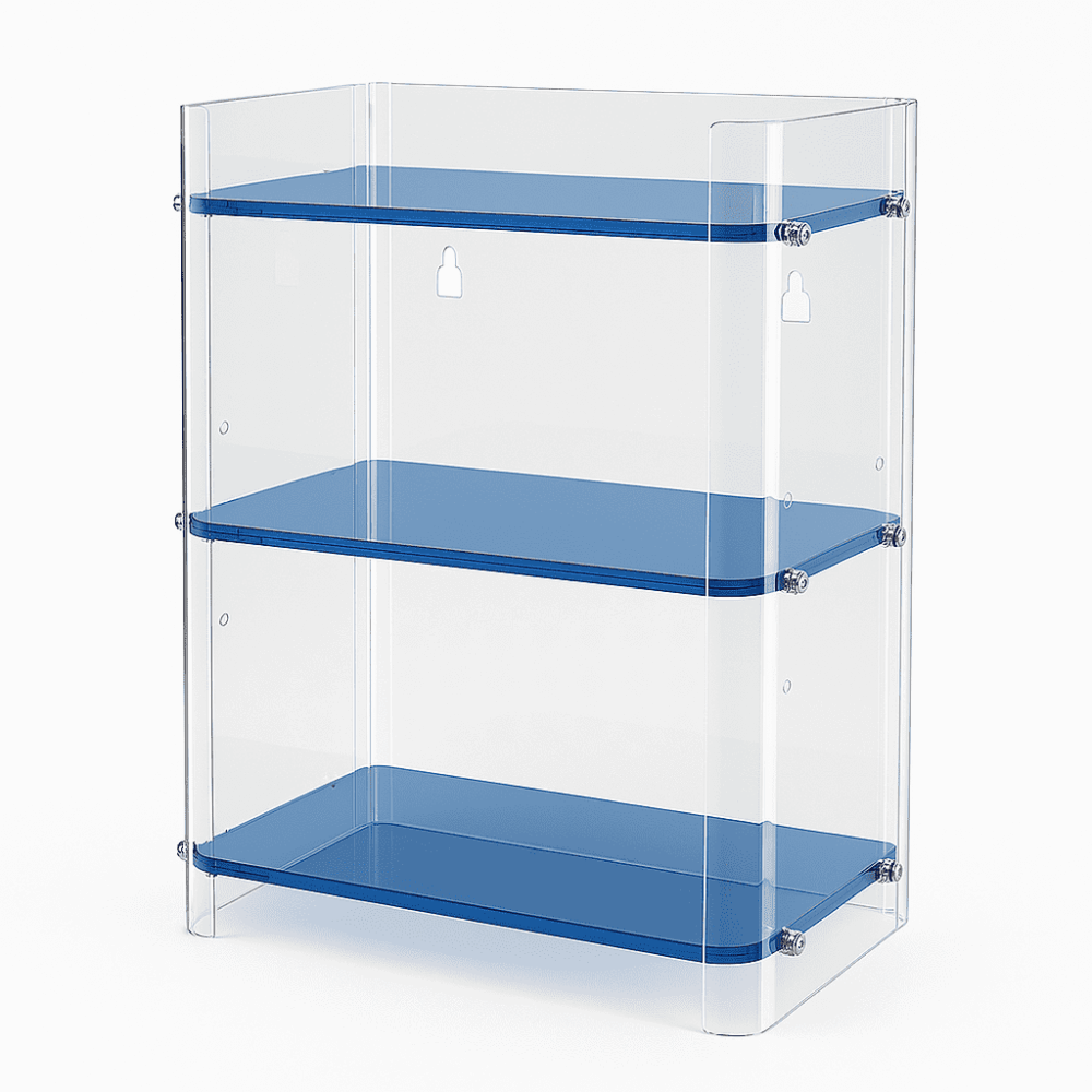 ארונית אקרילית שקופה 3 קומות עם מדפים כחולים – פתרון אחסון ותצוגה מעוצב!