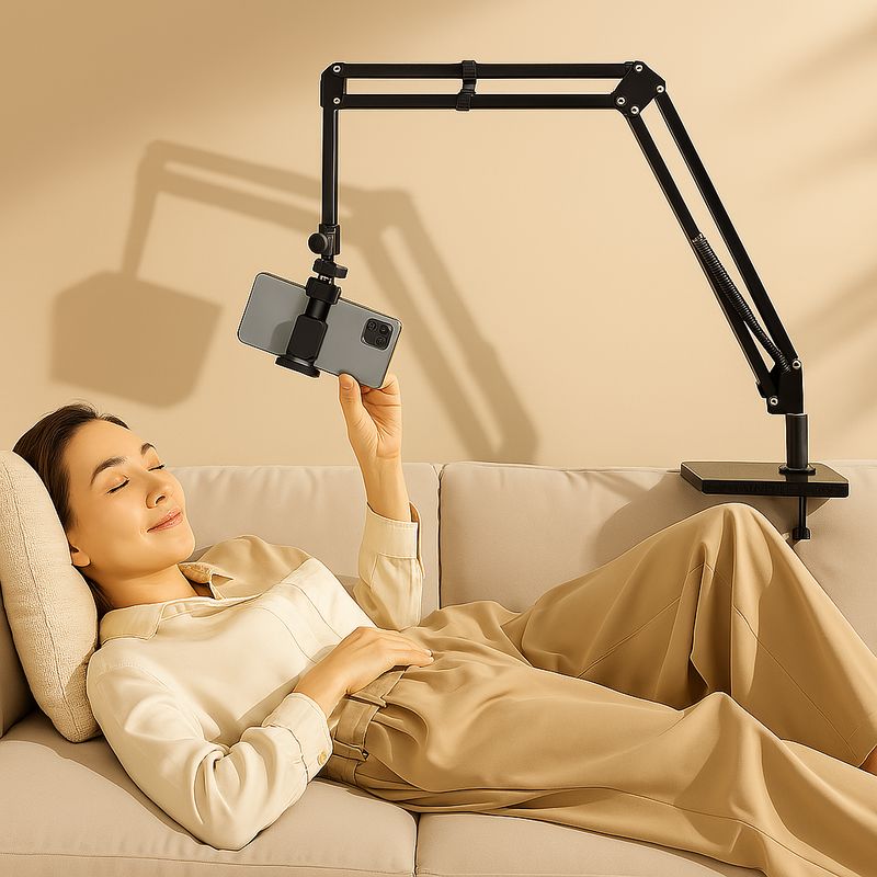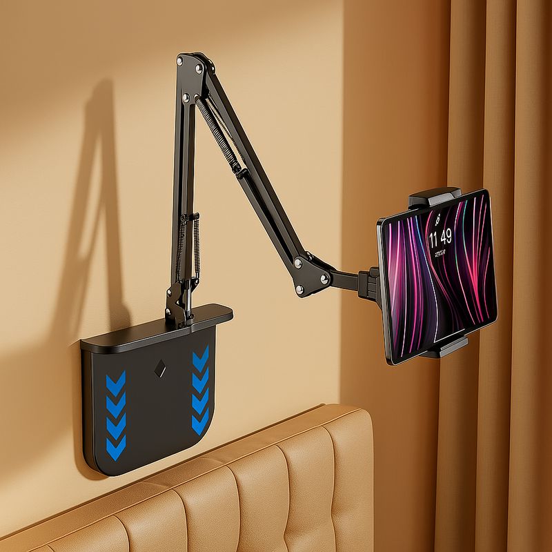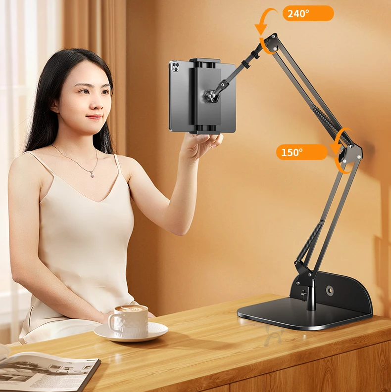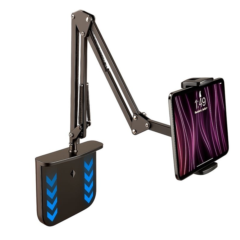 - עיצוב ארגונומי וגמיש: זרוע מכנית מתכווננת המאפשרת קיפול של עד 240° ו-150°, למקם את הטאבלט בדיוק איפה שנוח לכם – במיטה, על השולחן, או בכל מקום אחר.