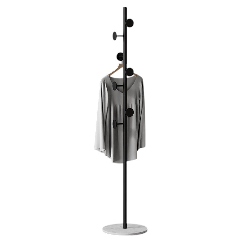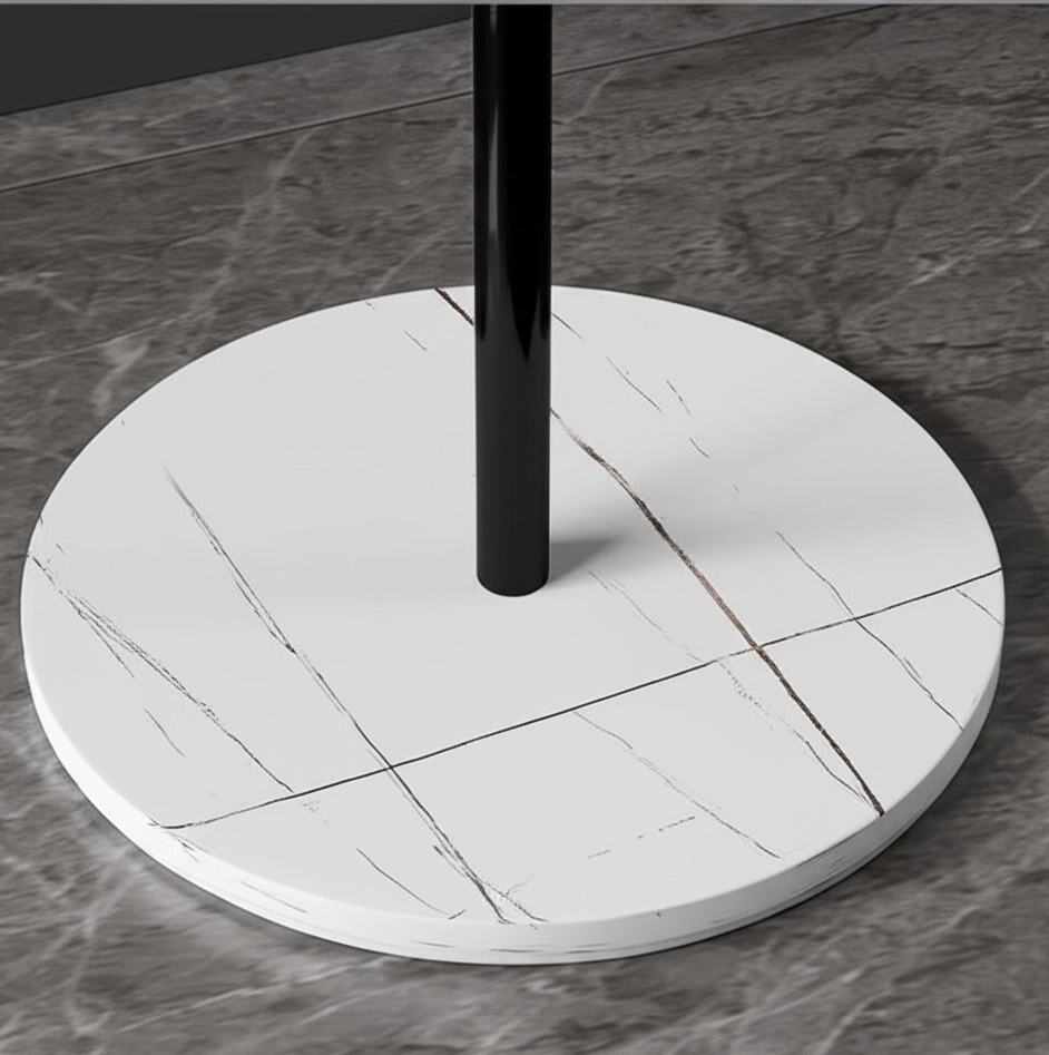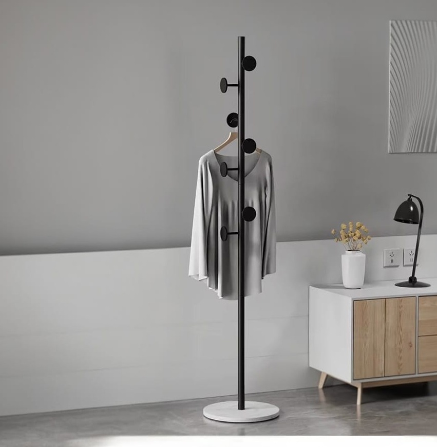 מתלה זה הוא לא רק פתרון אחסון פרקטי, אלא גם פריט עיצובי שמוסיף יוקרה. השילוב של בסיס השיש הכבד ומוט הפלדה החזק מבטיח איכות לאורך שנים.