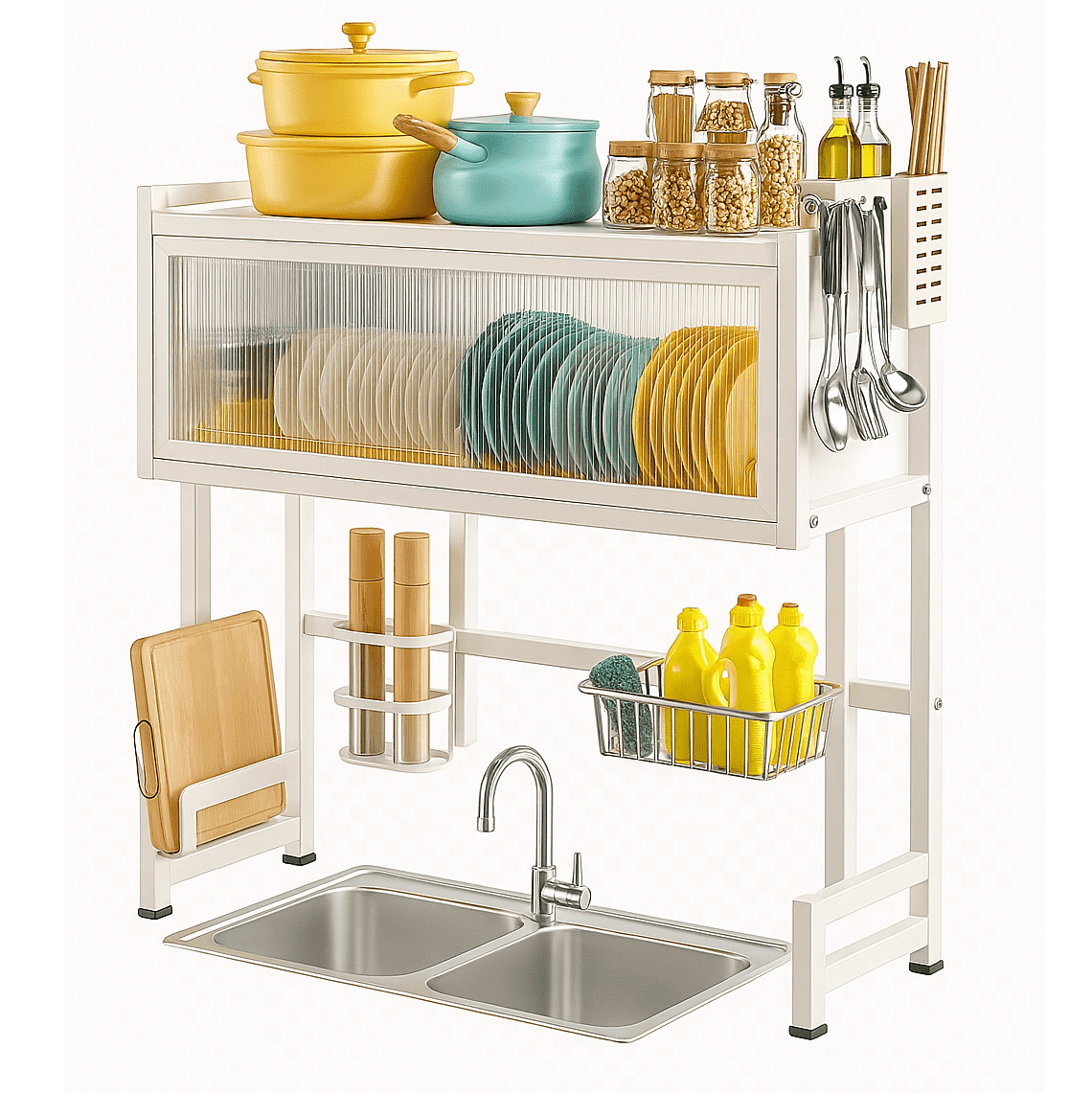 - חיסכון מקסימלי במקום: נצלו את השטח העל-כיורי ביעילות! המתקן משחרר את משטחי העבודה ומאפשר לכם מרחב רב יותר לבישול והכנת מזון.