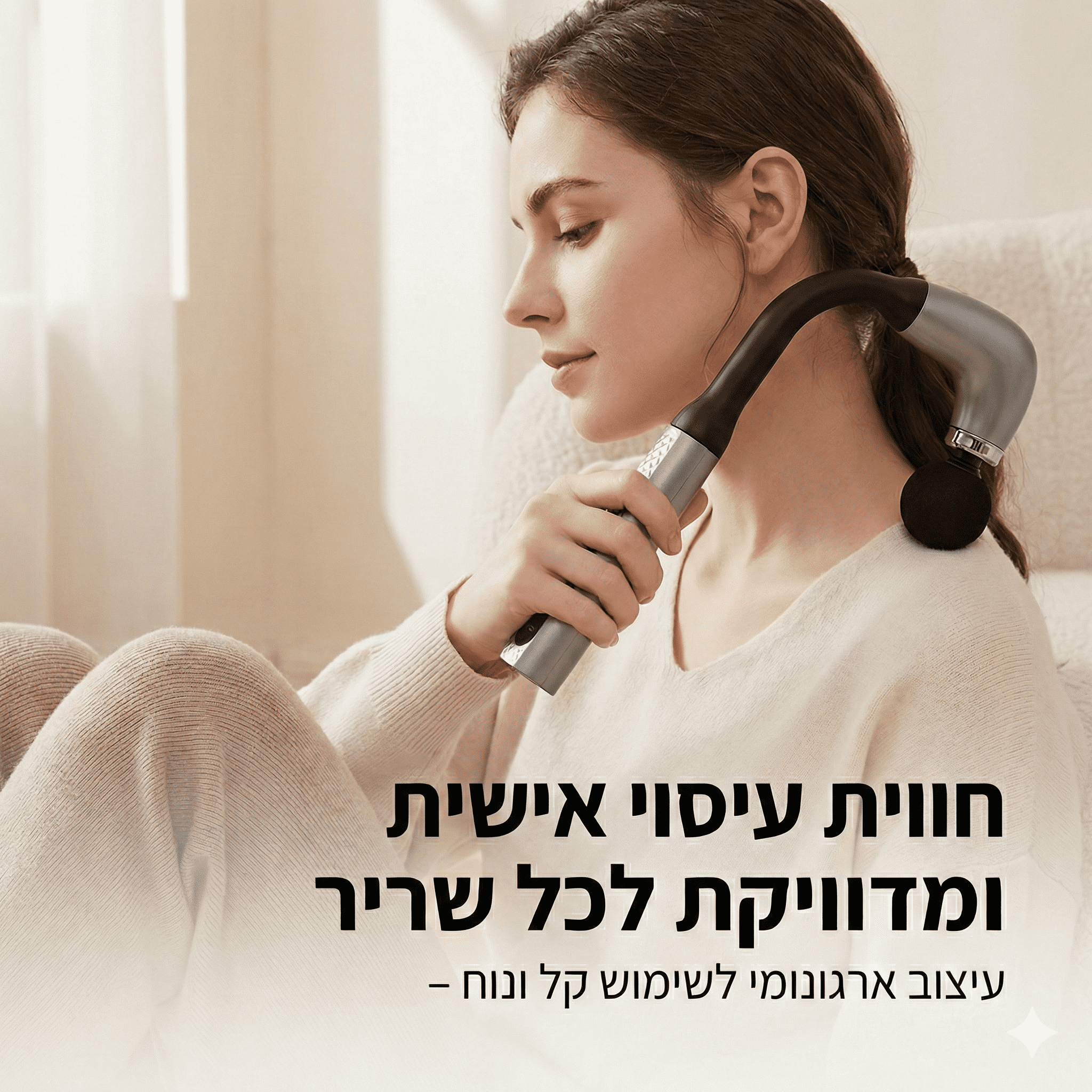 העיצוב הייחודי מאפשר להגיע בקלות לגב העליון, הגב התחתון, הכתפיים, הרגליים והצוואר – וליהנות מעיסוי עמוק ומדויק בכל זמן ובכל מקום.