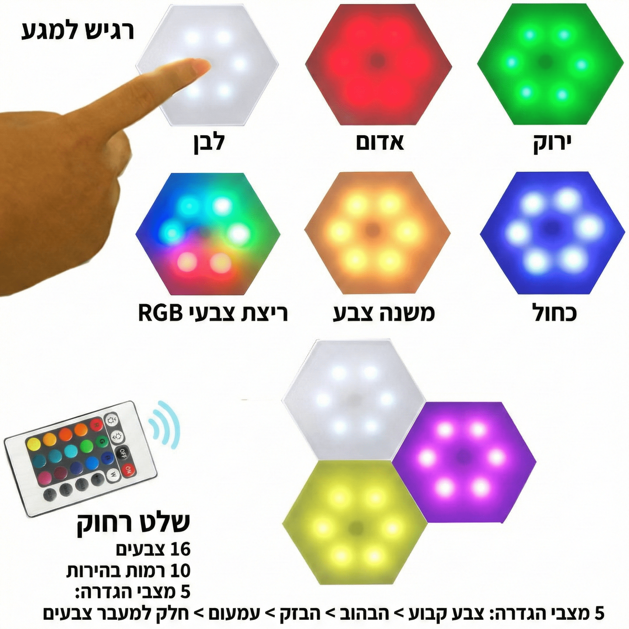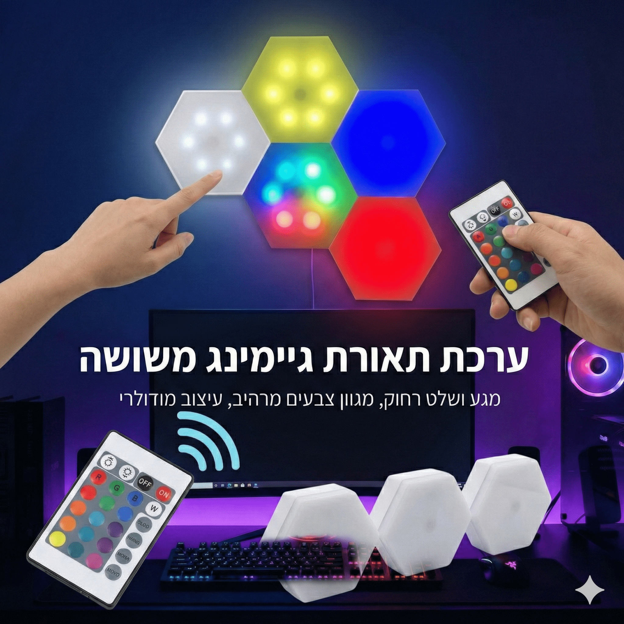 שדרגו את עיצוב החדר ברגע עם סט מנורות משושה מודולריות! מערכת תאורה חכמה המאפשרת יצירת צורות בהתאמה אישית, עם שליטה כפולה (מגע ושלט רחוק) ומגוון עצום של צבעי RGB. פתרון מושלם לעמדות גיימינג, חדרי שינה ועיצוב אווירה ייחודית. התקנה קלה ללא קידוח.