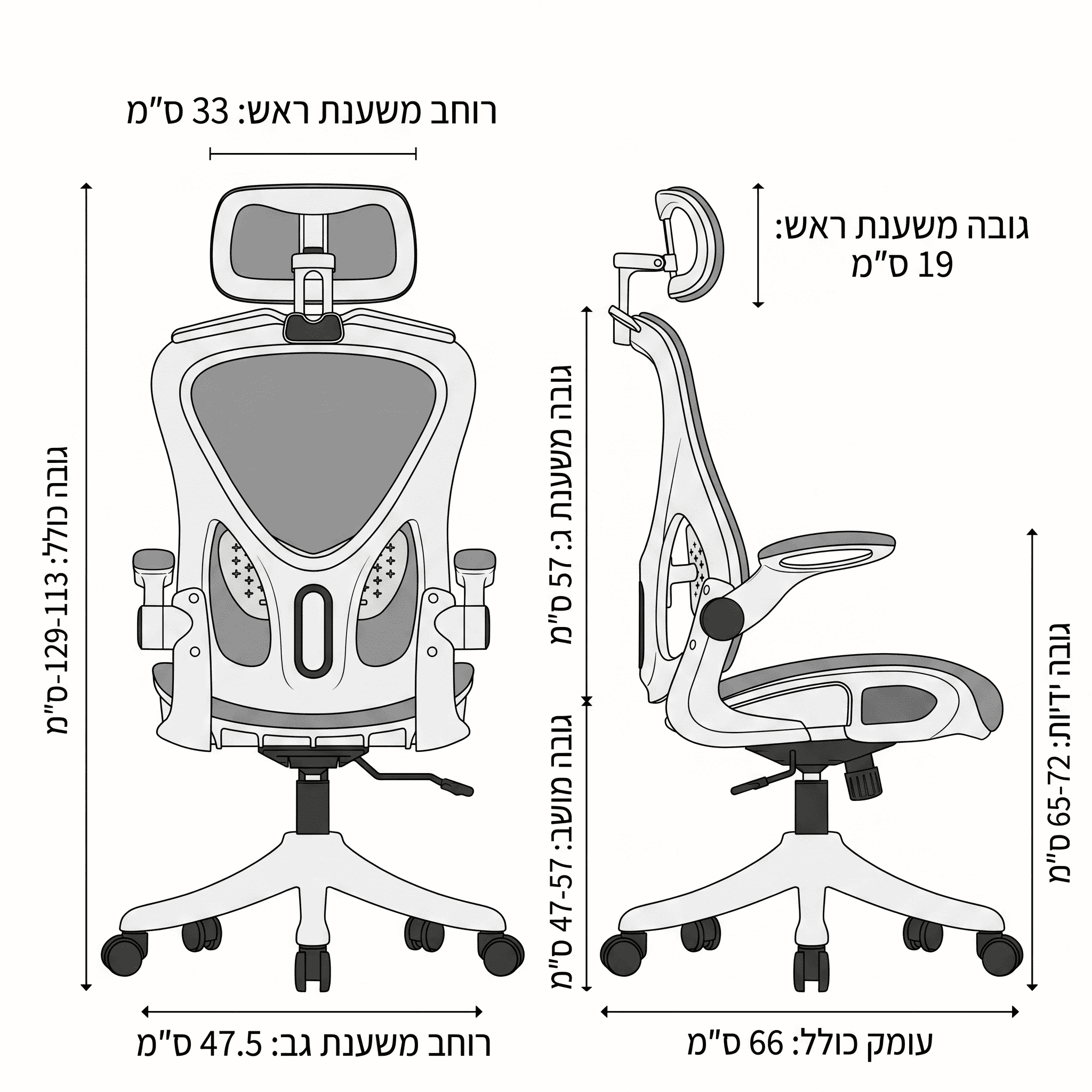 מידות (ב-ס״מ בלבד): גובה כולל 113-129, גובה מושב 47-57, רוחב משענת גב 47.5, עומק כולל 66, רוחב משענת ראש 33, גובה ידיות 65-72. (ראו תרשים מידות לתמונת המידות המלאה).