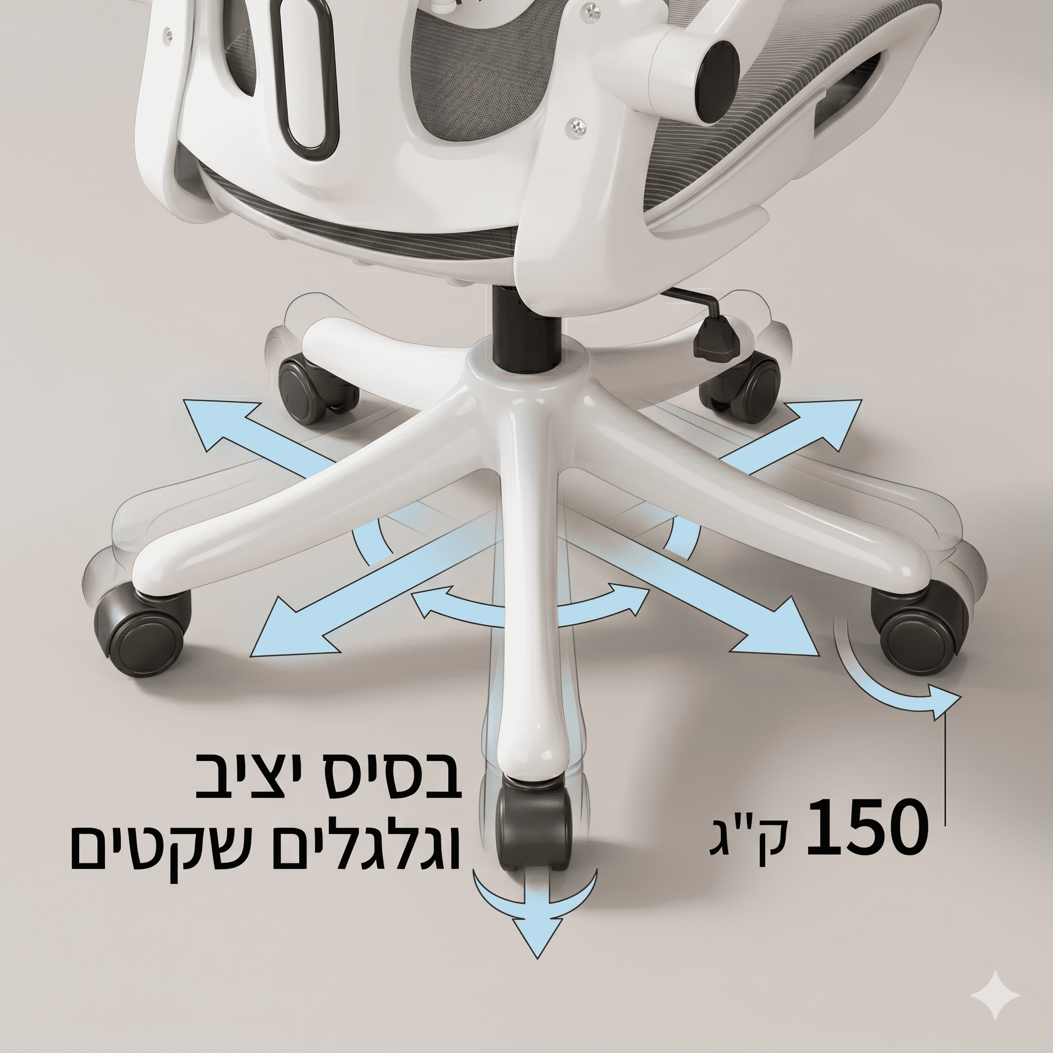 בסיס חזק וגלגלים שקטים: בסיס חזק וגלגלי סיליקון 50 מ"מ המאפשרים תנועה חלקה, שקטה וללא סימנים על הרצפה.