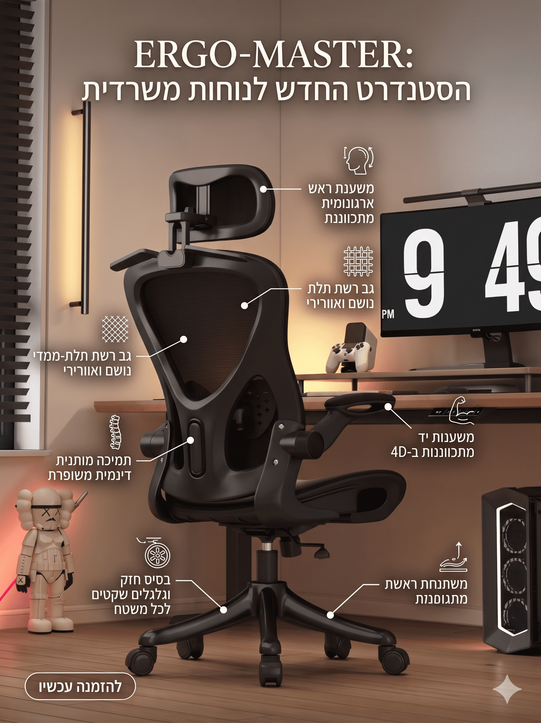 משענת ראש 4D מתקדמת: כיוונון גובה (9 ס״מ), כיוונון קדימה/אחורה (3 ס״מ) וכיוונון זווית (45 מעלות) לתמיכה מלאה בכל מצב.