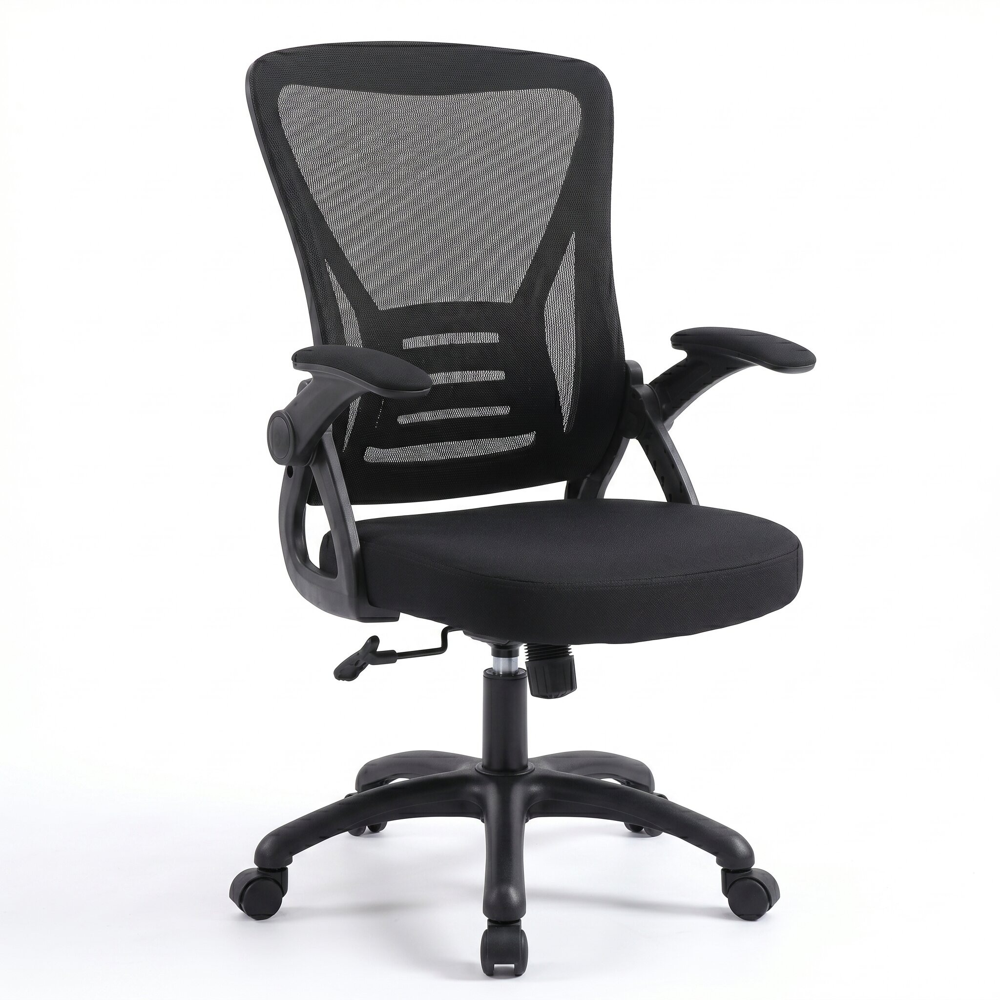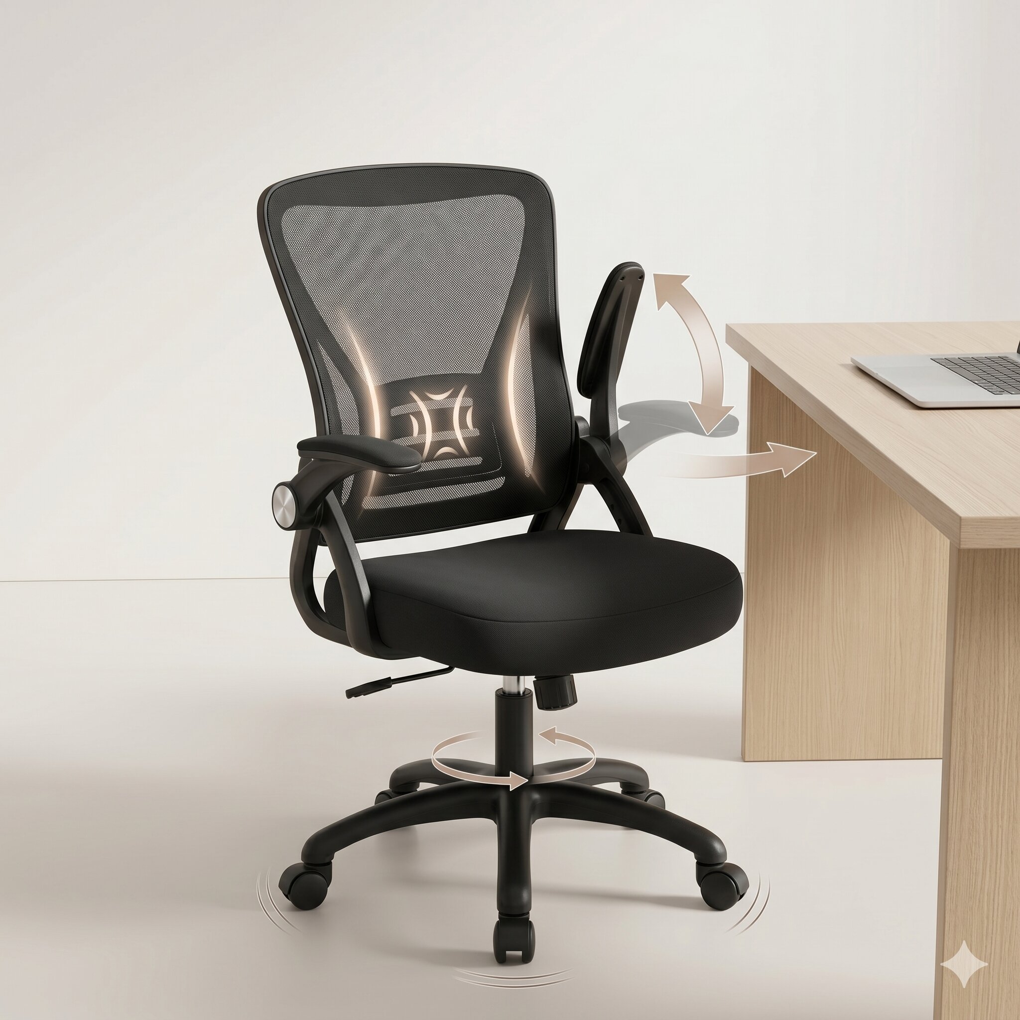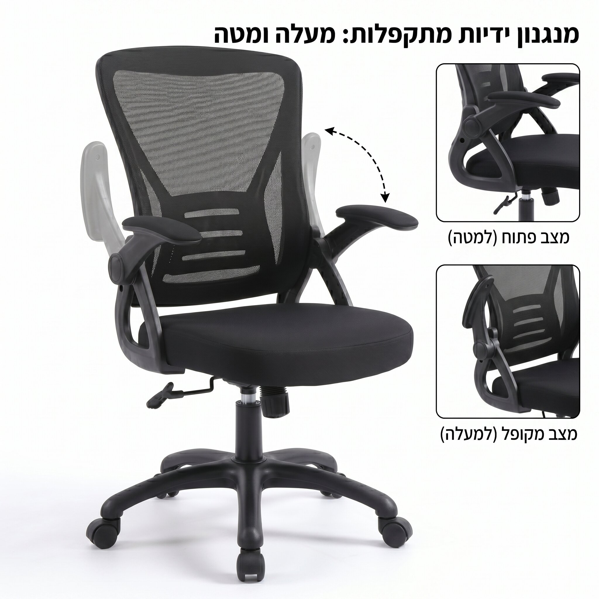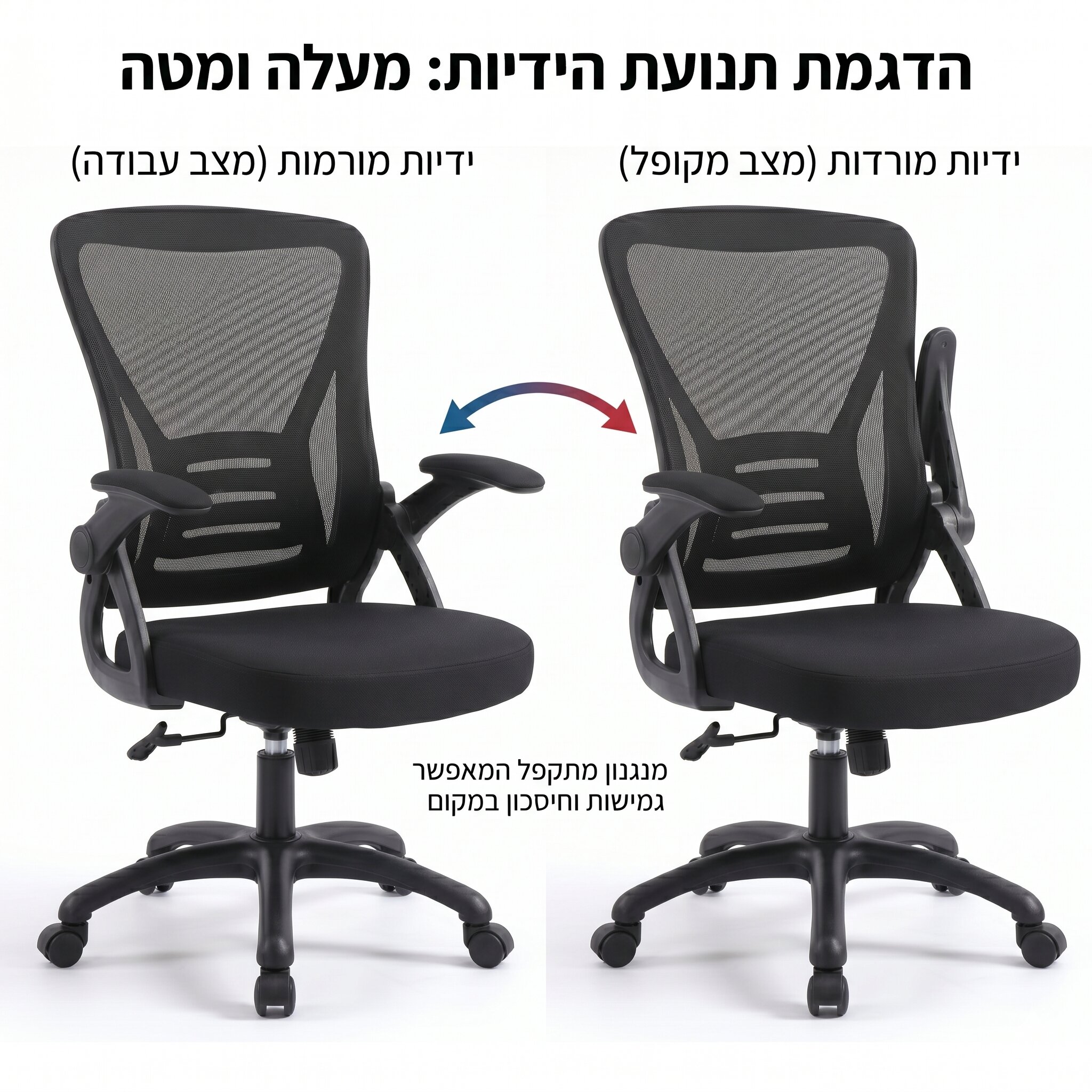 משענות יד מתקפלות (Up & Down): הפתרון האידיאלי לסביבת עבודה קומפקטית. משענות היד מתקפלות לאחור בקלות, מה שמאפשר לקרב את הכיסא עד הסוף לשולחן או לאחסן אותו מתחתיו בסיום יום העבודה.