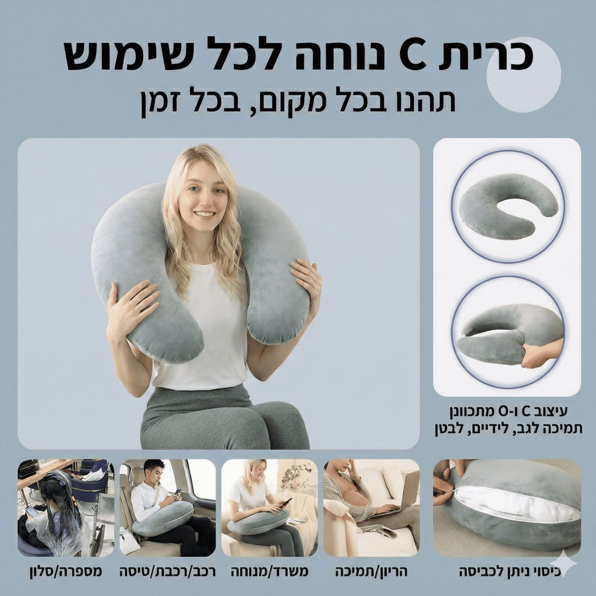 חוויה של רכות ותמיכה בכל מקום ובכל זמן בין אם אתם מחפשים הקלה על הגב, זקוקים לתנוחה נוחה להנקה, או רוצים לשדרג את הנוחות בטיסה – כרית הירח (Moon Pillow) היא הבחירה האידיאלית. העיצוב החכם בצורת האות C עוטף את הגוף ומעניק תמיכה היקפית בדיוק איפה שצריך.