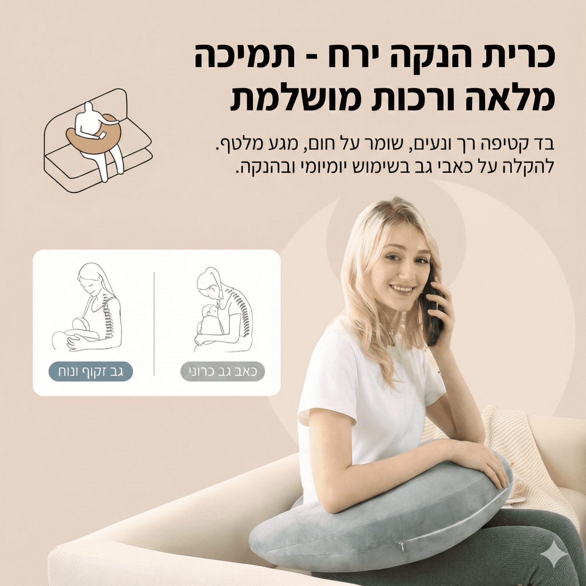 מושלמת להנקה והאכלה: הכרית מרימה את התינוק לגובה נוח, מורידה עומס מהידיים והכתפיים של ההורה ומאפשרת הנקה או האכלה מבקבוק בתנוחה בריאה ורגועה (שומרת על גב זקוף).