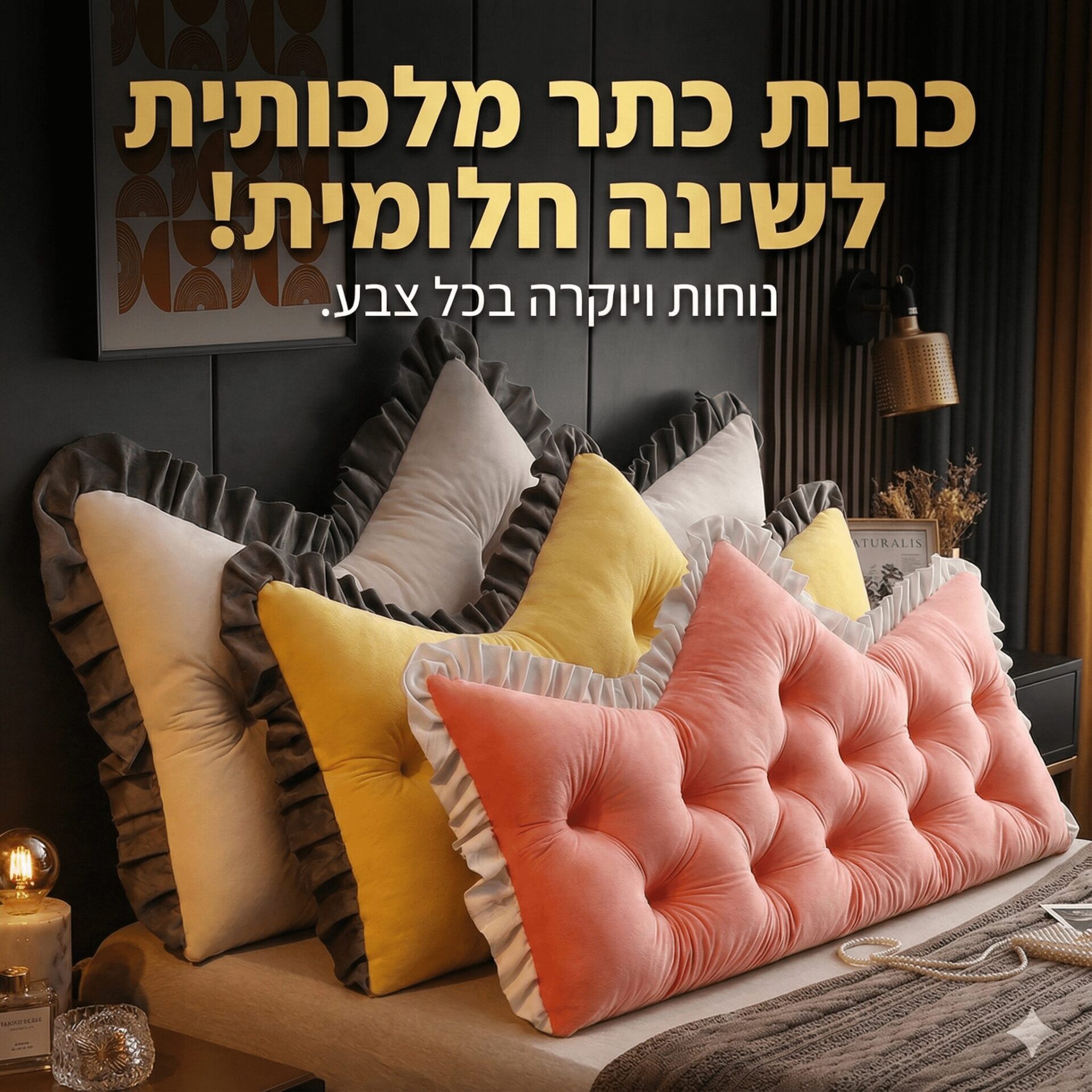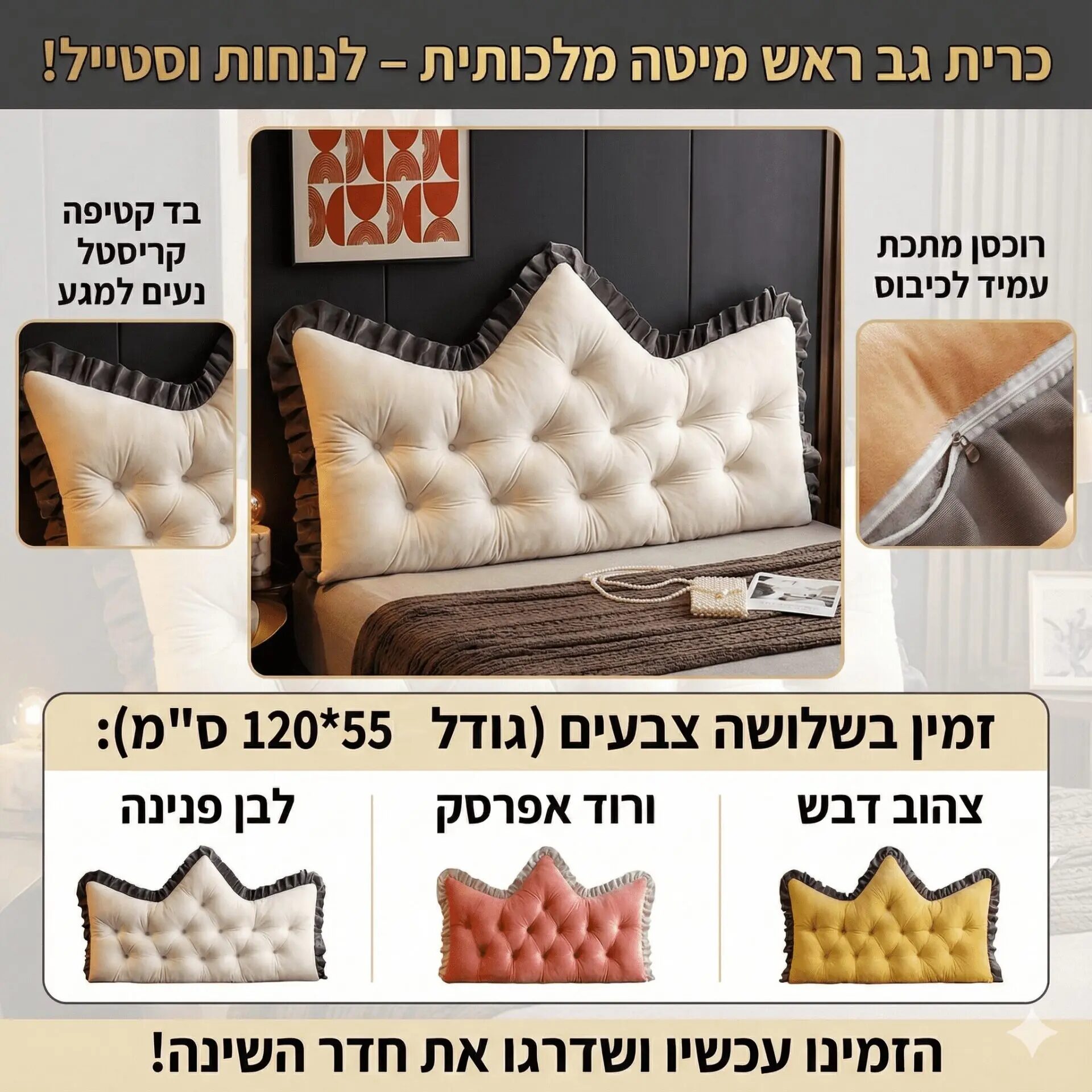 כרית גב מעוצבת בצורת כתר יוקרתי, המהווה תחליף מושלם או תוספת לראש מיטה. הכרית משלבת עיצוב מרהיב עם פונקציונליות, ומעניקה תמיכה אורטופדית רכה לגב ולצוואר בעת ישיבה, קריאה או מנוחה במיטה.