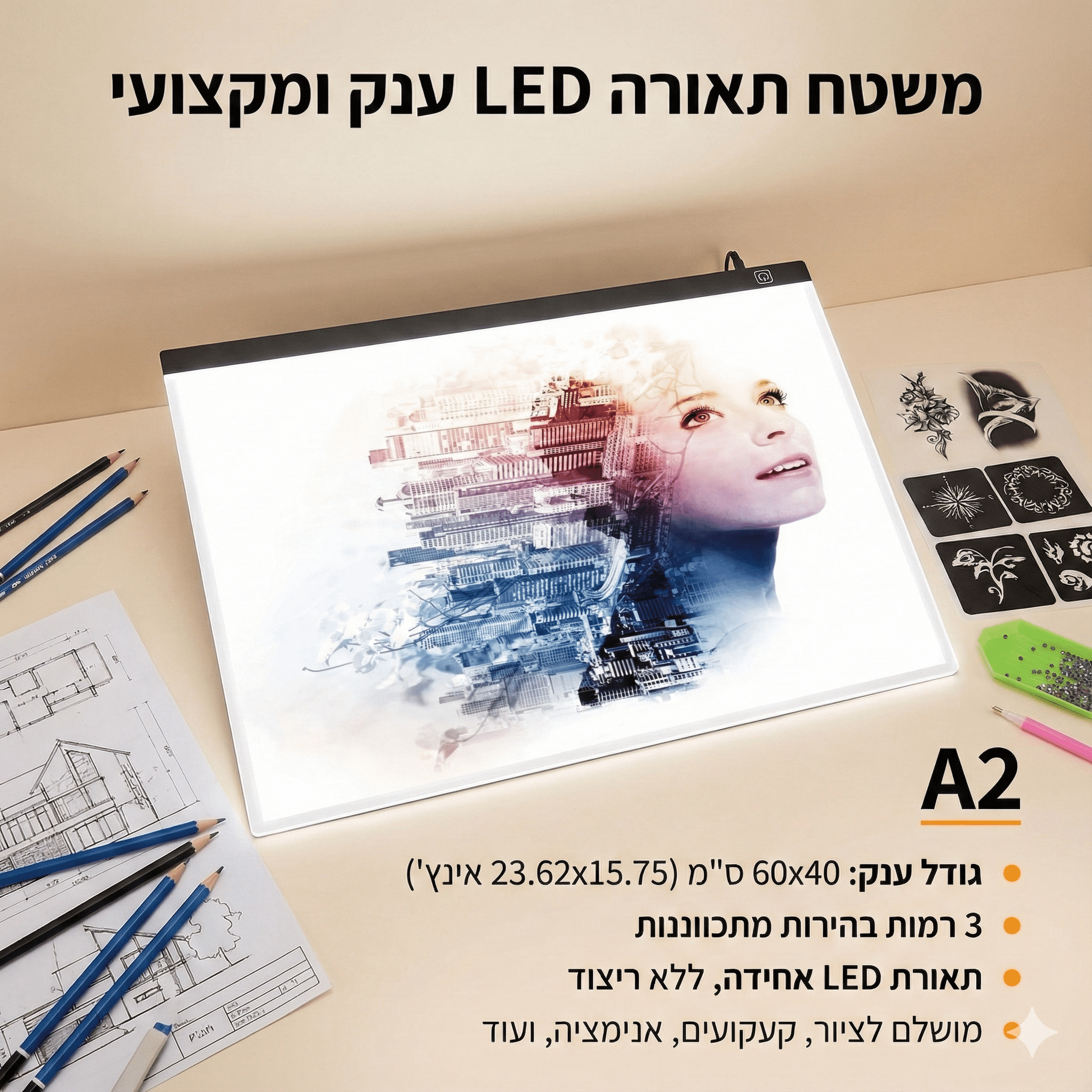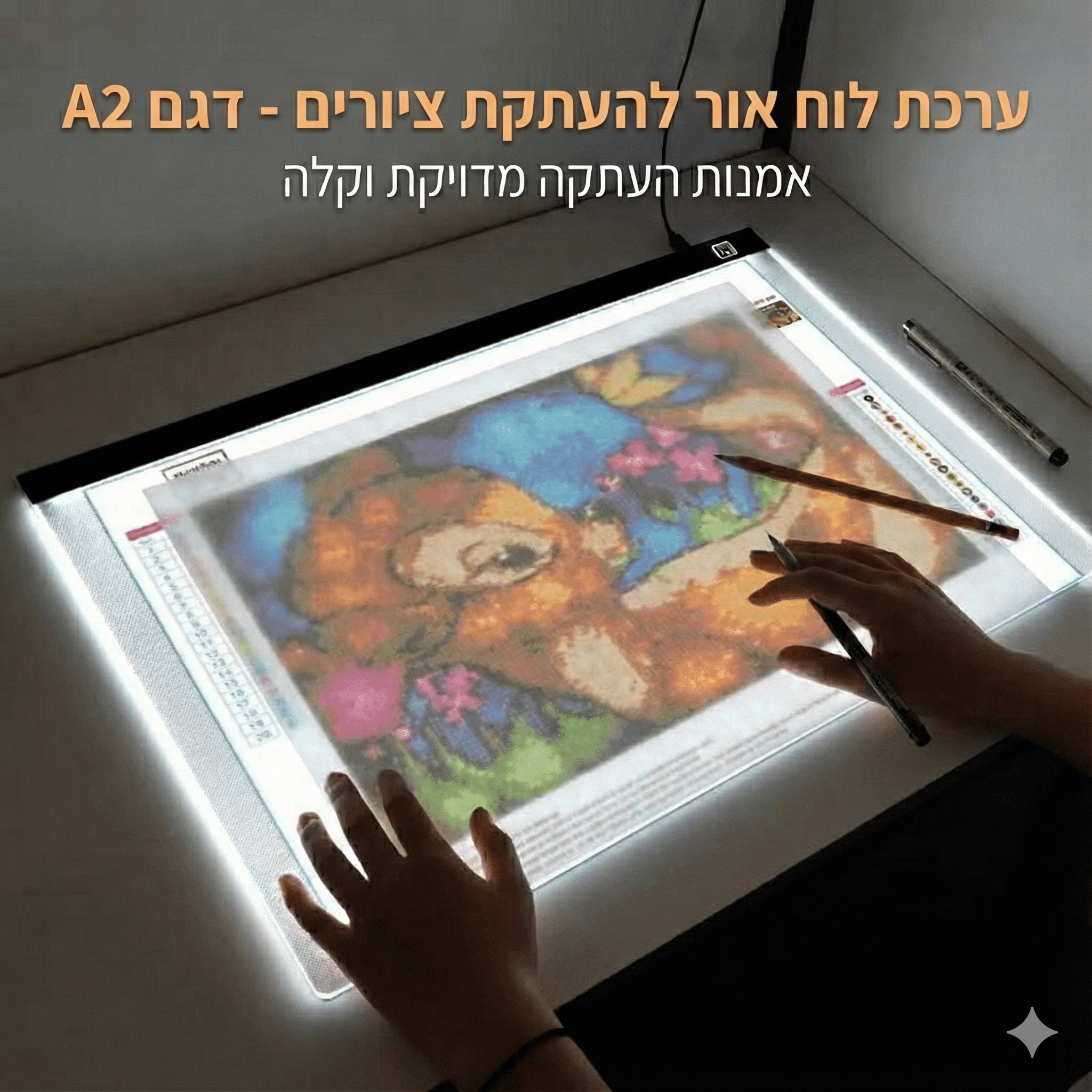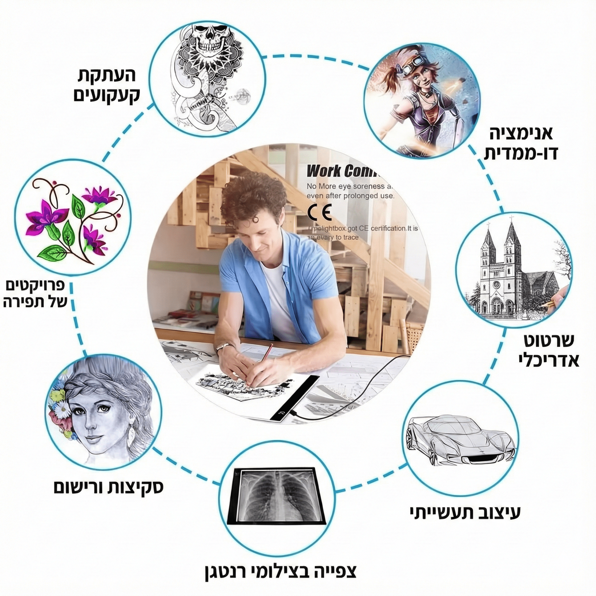 ראו את היצירה שלכם באור חדש – תרתי משמע! בין אם אתם מקעקעים מקצועיים, אדריכלים, אנימטורים או חובבי ציור יהלומים, לוח האור הזה הוא הכלי שישדרג את הדיוק והנוחות שלכם בעבודה. עם משטח עבודה ענק בגודל A2, כבר אין צורך להצטופף – יש לכם מקום לכל רעיון.