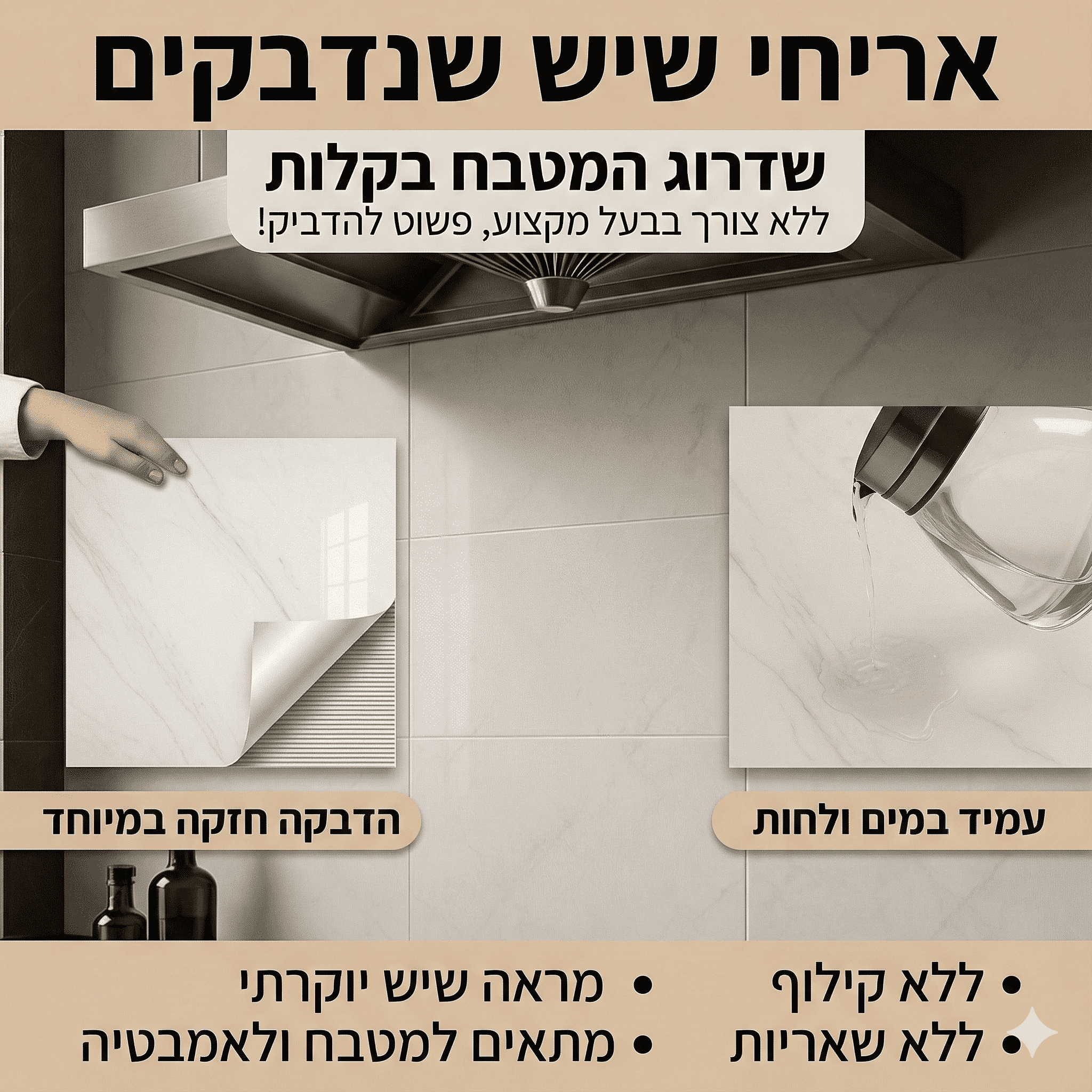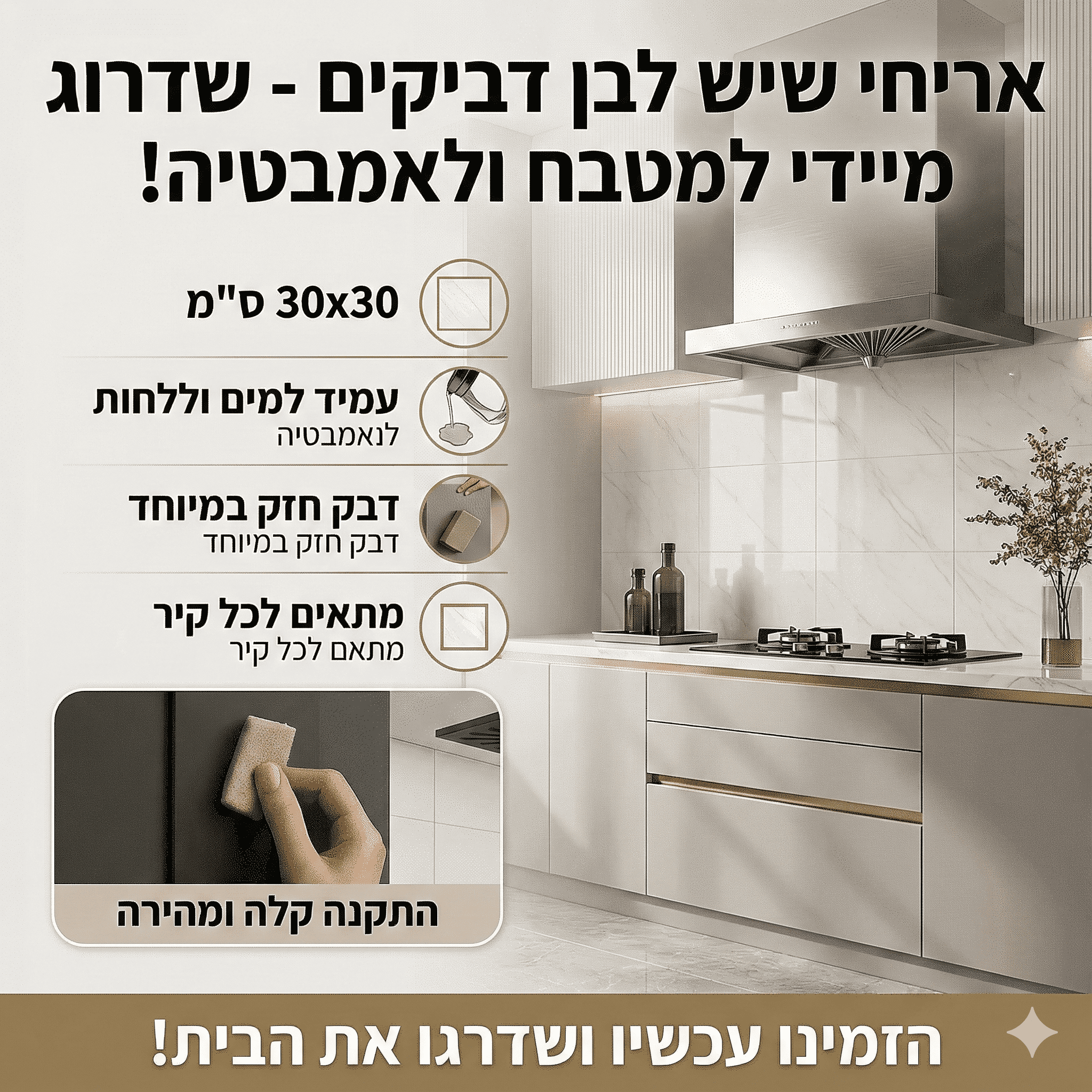 הפכו כל חלל בבית לפנינה עיצובית עם מדבקות הקרמיקה התלת-ממדיות שלנו, המעניקות מראה מציאותי ועומק ויזואלי של אריחי שיש יוקרתיים. העיצוב החדשני יוצר אשליה של מרקם וצללים, למראה קרמיקה אמיתית – והכל בהדבקה עצמית פשוטה ומהירה!