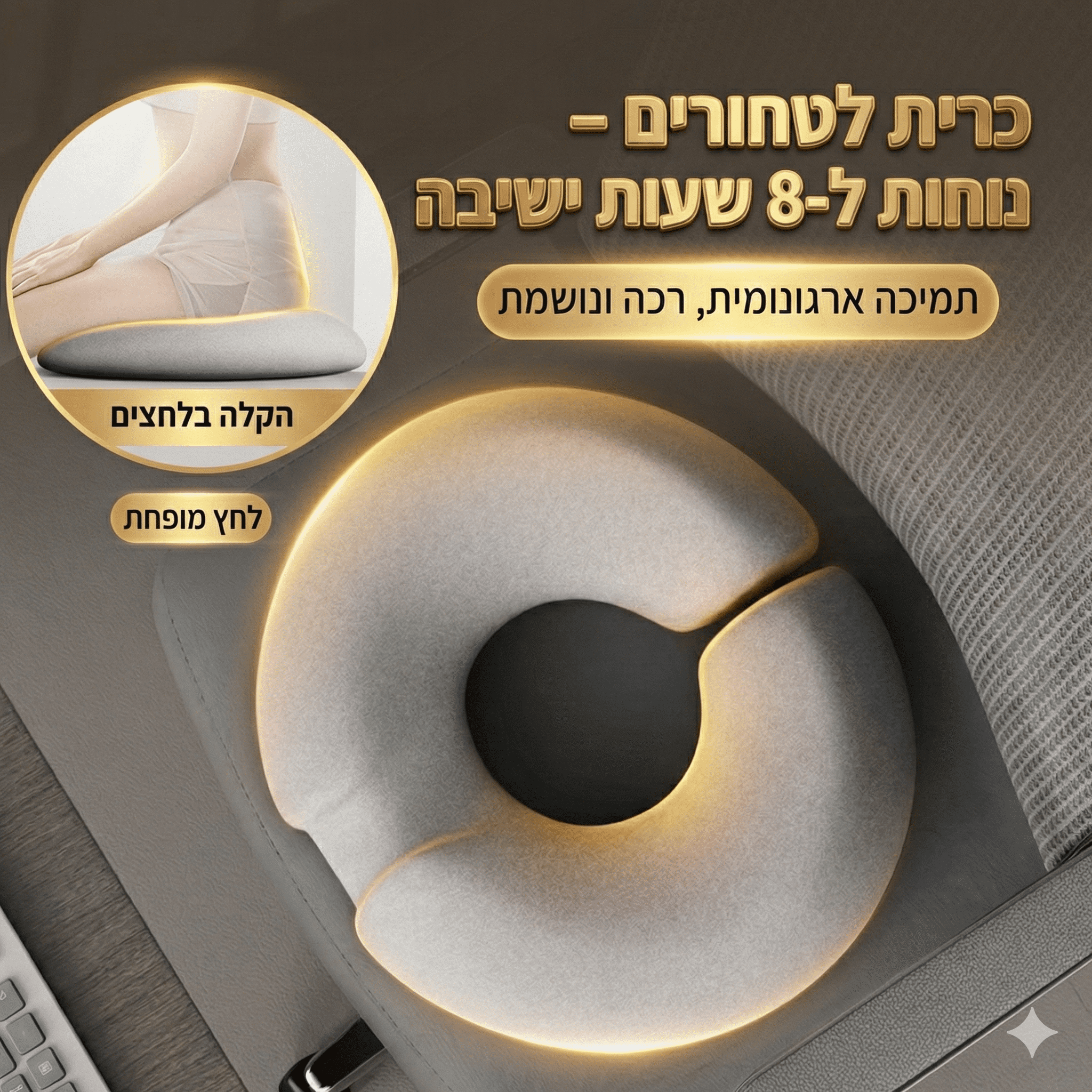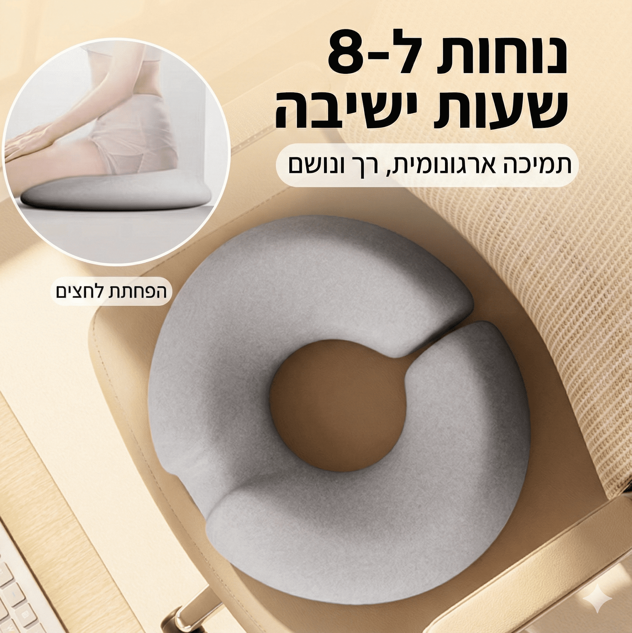 הקלה מיידית על כאבים: העיצוב הפתוח במרכז מוריד עומס ישיר מאיזור עצם הזנב (Coccyx) ומעולה לסובלים מטחורים, כאבי גב תחתון או לנשים בהריון ולאחר לידה.