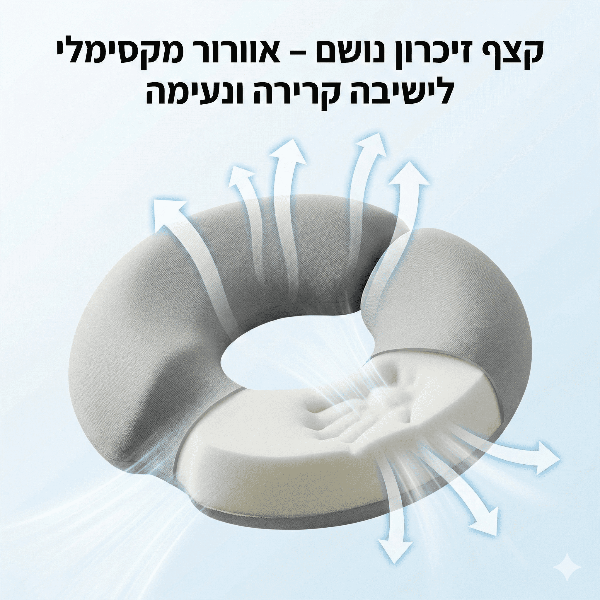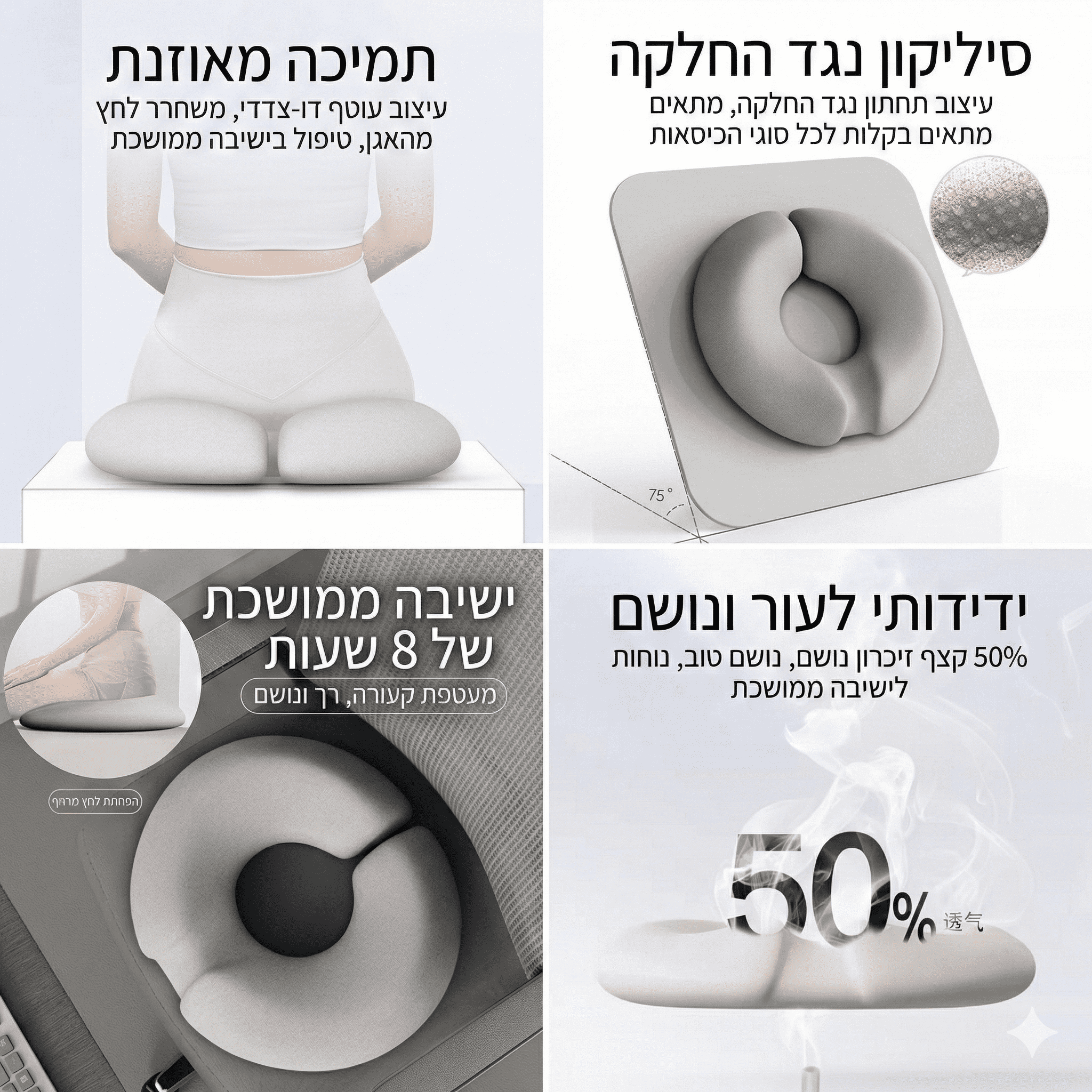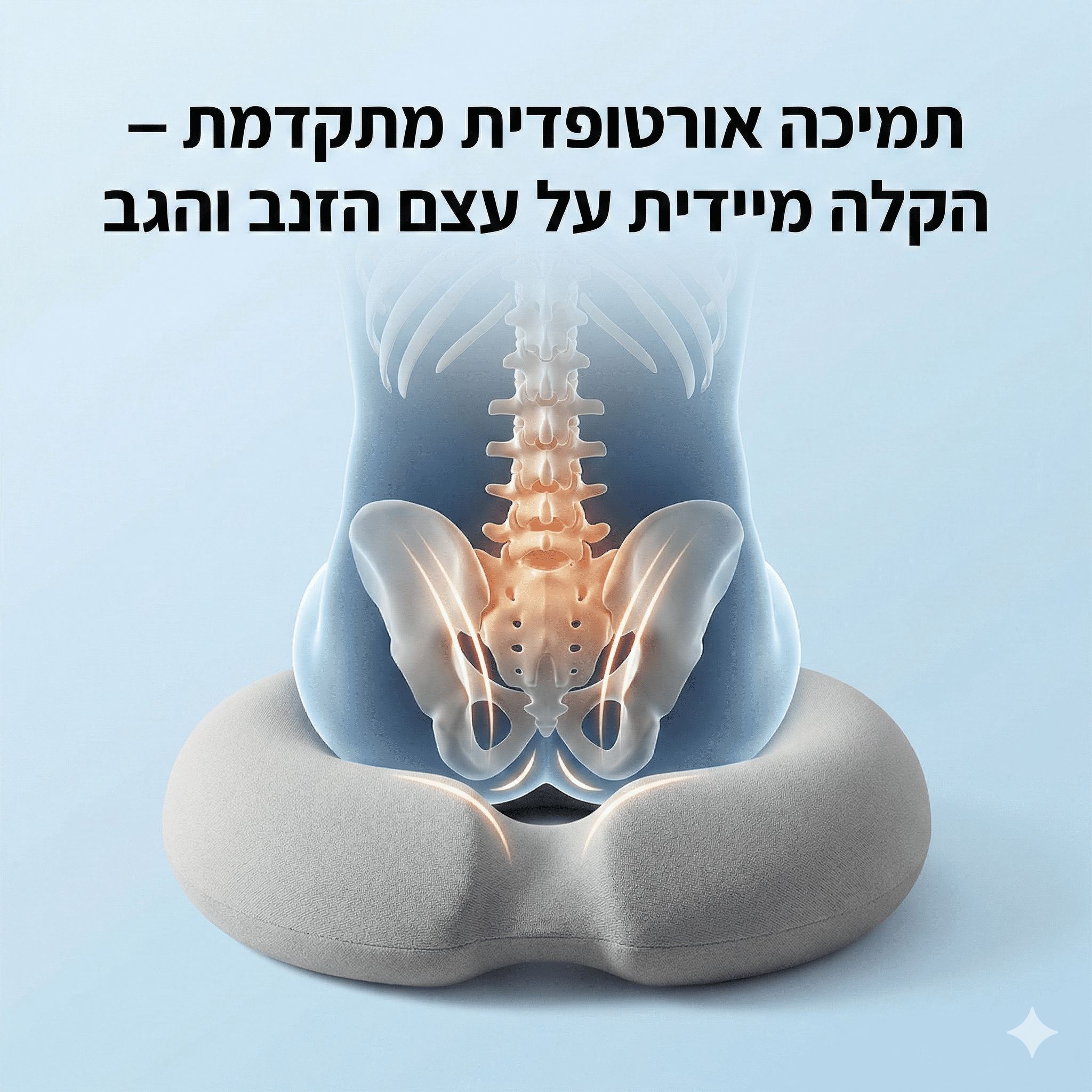 יושבים שעות ארוכות מול המחשב? מרגישים לחץ בגב התחתון או אי נוחות באגן? כרית הישיבה האורטופדית שלנו תוכננה במיוחד כדי להפוך כל כיסא רגיל למושב בריאותי ותומך. בזכות עיצוב ה-O (דונאט) הייחודי וחומר הויסקו המתקדם, הכרית מספקת פיזור לחצים אידיאלי ומאפשרת לכם לשבת בנוח לאורך זמן.