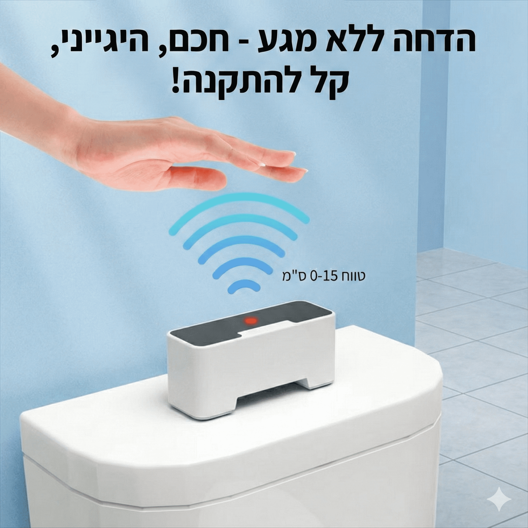 הדחה ללא מגע בהנפת יד – מכשיר הדחה חכם עם חיישן תנועה לטווח 0–15 ס"מ, לשמירה על היגיינה ונוחות. עיצוב קומפקטי, התקנה פשוטה ושימוש קל – מתאים לחדרי רחצה בבית, במשרד ובקליניקות.