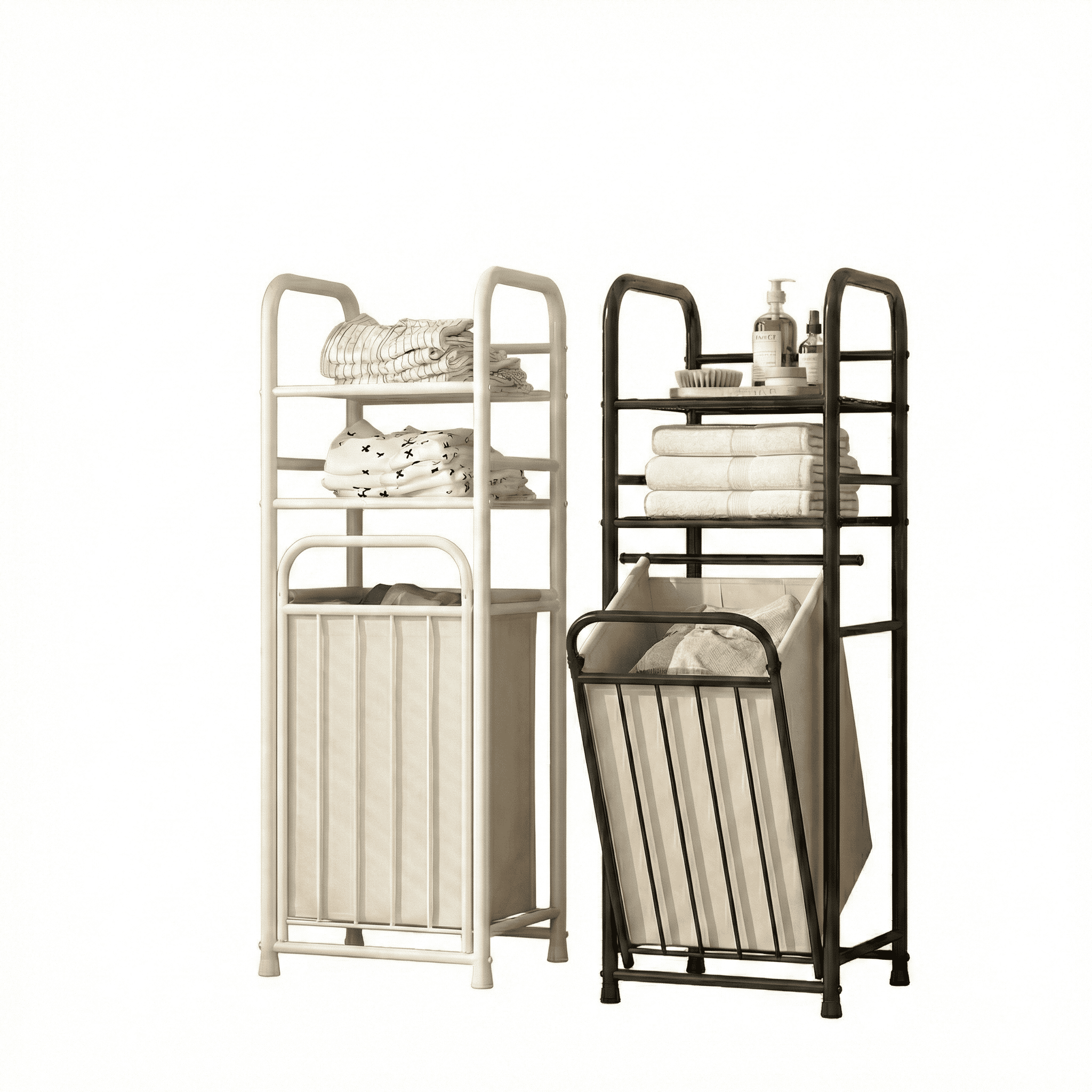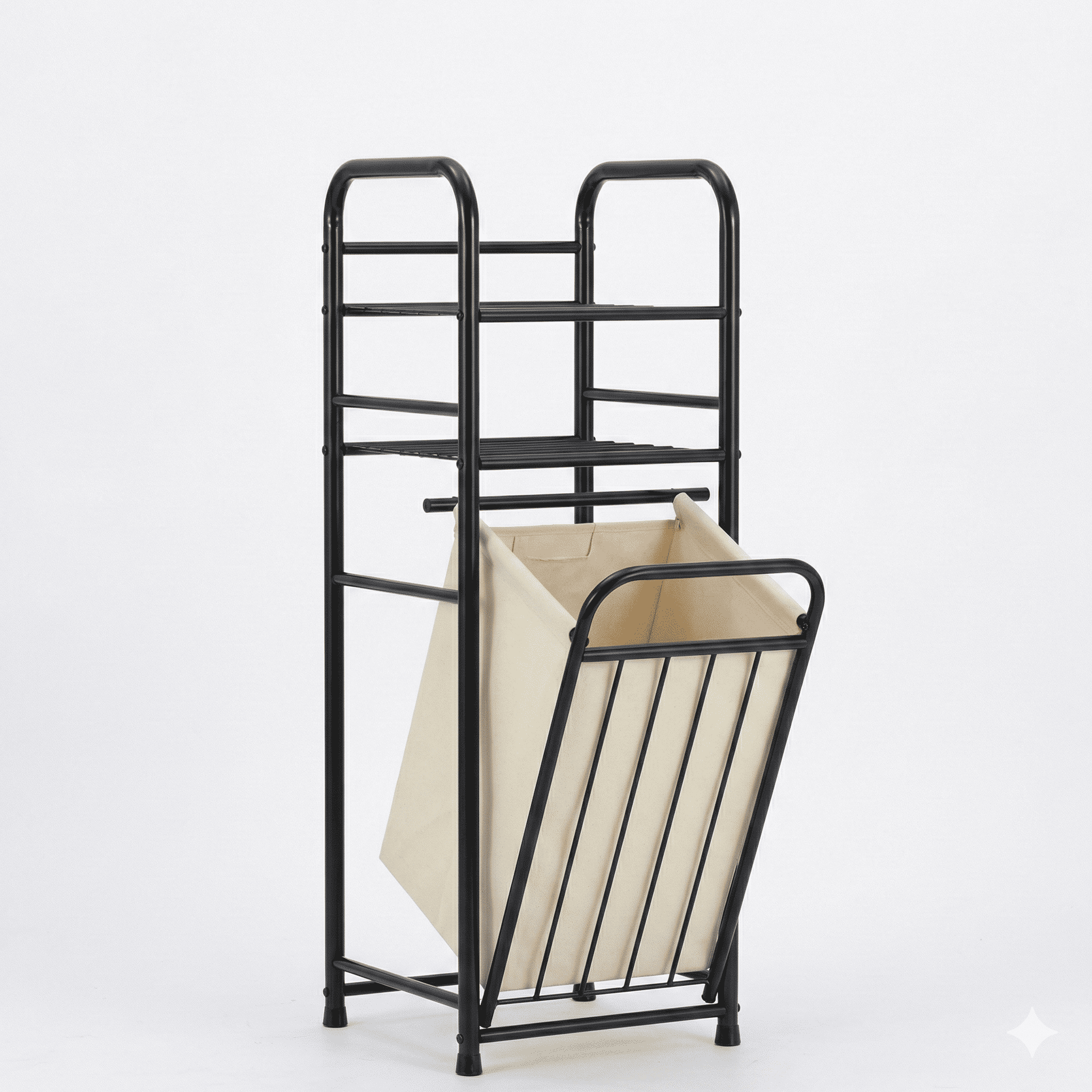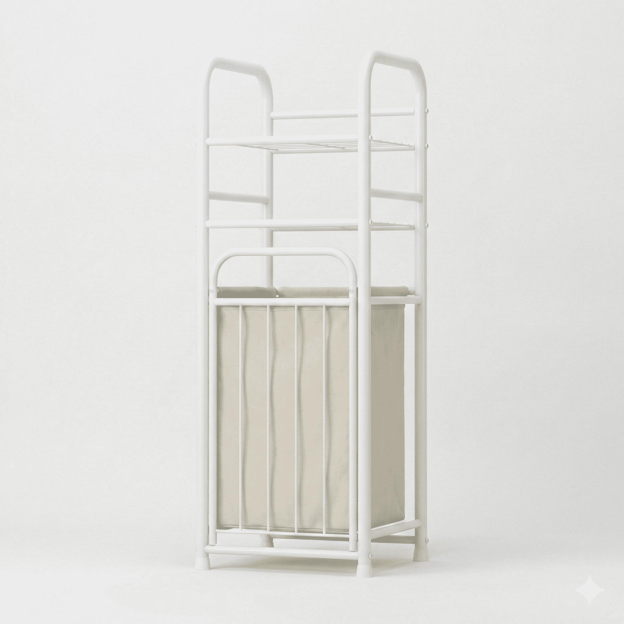 עיצוב 2 ב-1 חכם: גם סל כביסה וגם מדפי אחסון ביחידה אחת. החלק התחתון כולל סל כביסה מרווח מבד איכותי, והחלק העליון מציע שני מדפי רשת יציבים לארגון מגבות, תמרוקים, חומרי ניקוי או דקורציה.