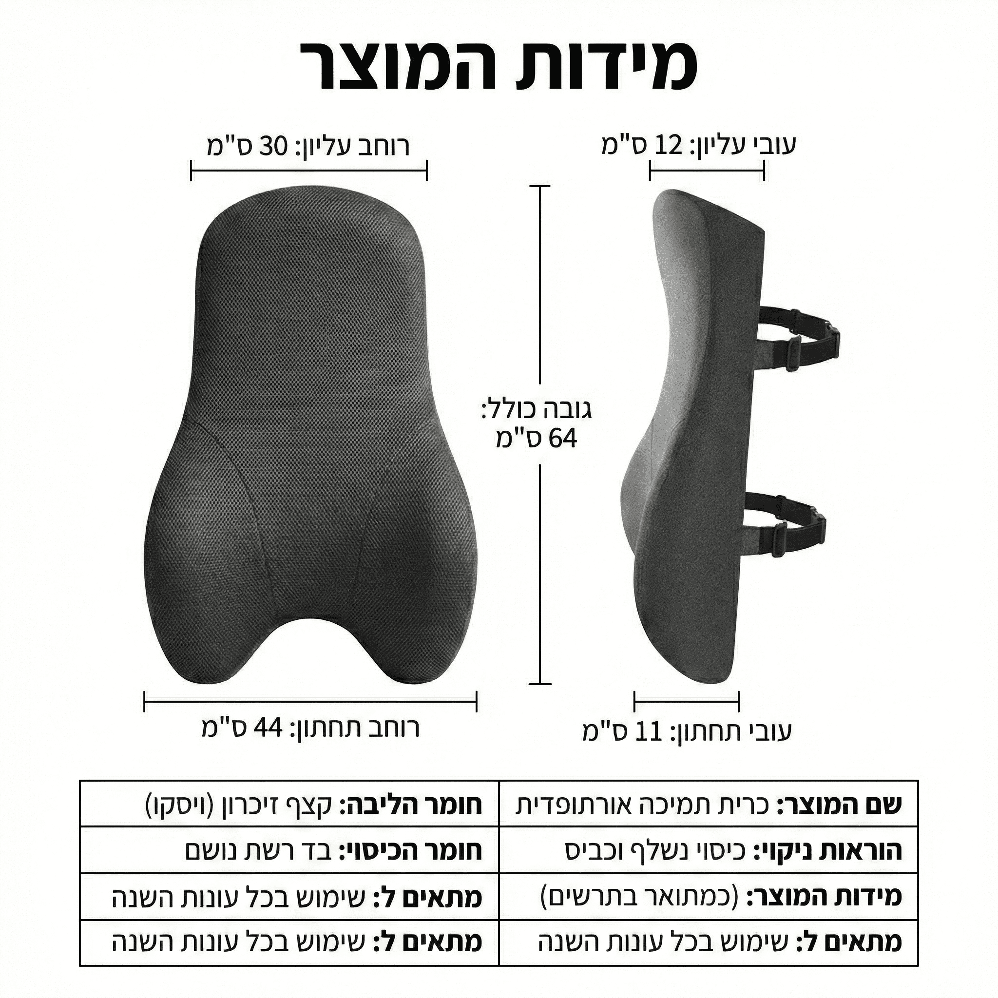 יציבות ללא פשרות: מצוידת בשתי רצועות קשירה חזקות ומתכווננות (Dual Straps) המבטיחות שהכרית תישאר במקומה ולא תחליק על המשענת, בניגוד לכריות עם רצועה אחת.