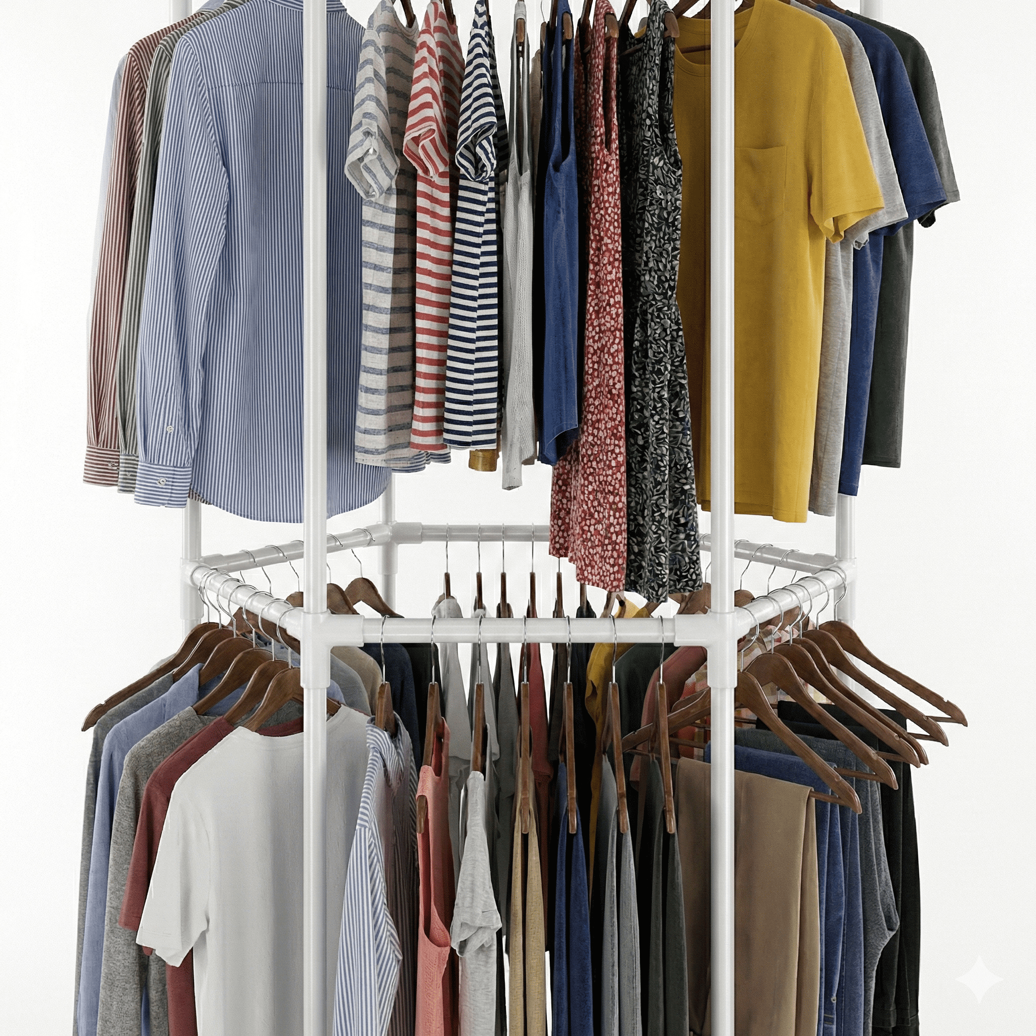 קיבולת כפולה (Double Layer): עיצוב דו-קומתי בגובה 175 ס"מ המאפשר הפרדה בין חולצות, מכנסיים, שמלות ומעילים, ומכפיל את כמות הבגדים שניתן לאחסן.
