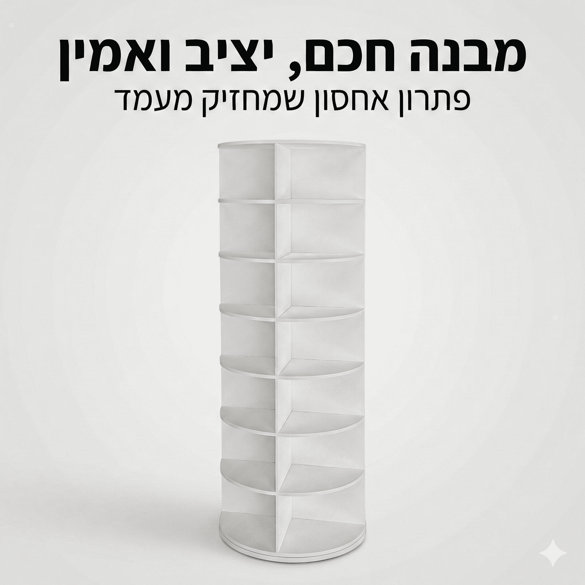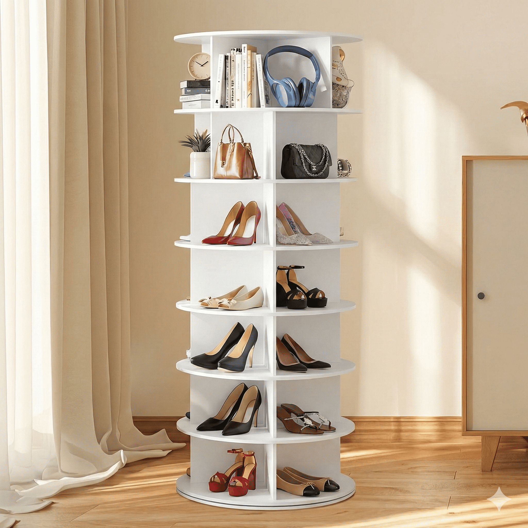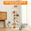 אם נמאס לכם מערימות ליד הדלת או מארון צפוף — מתקן הנעליים המסתובב נותן פתרון חכם: מבנה אנכי עם 7 קומות שמאפשר לאחסן הרבה זוגות על שטח קטן, ובזכות סיבוב 360° מגיעים בקלות לכל זוג נעליים מכל צד.