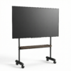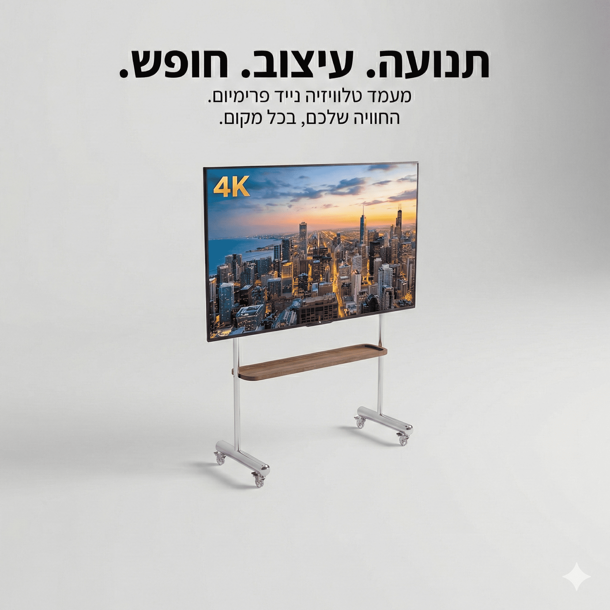 ניידות מלאה: המעמד מצויד בגלגלי סיליקון איכותיים (עם נעילה) המאפשרים להעביר את המסך בקלות בין חדרים או לשנות את זווית הצפייה ללא מאמץ.