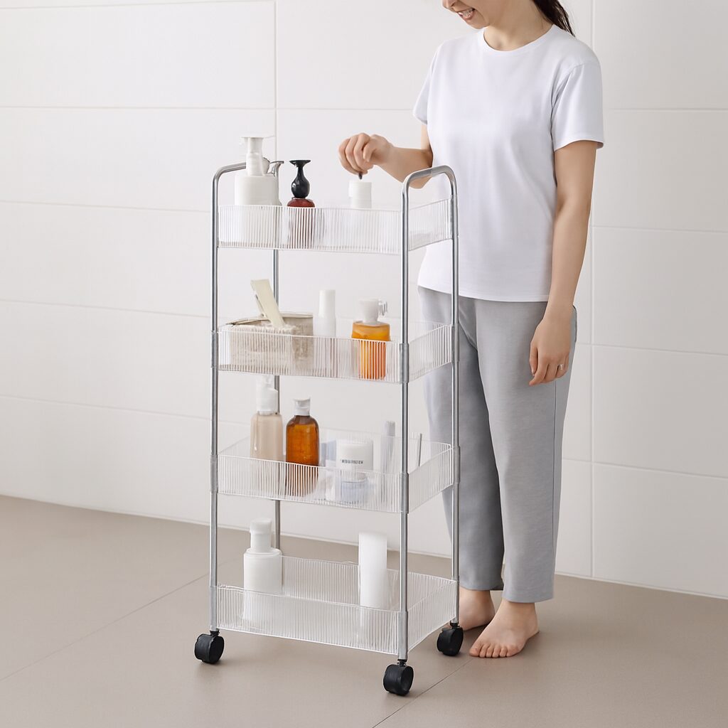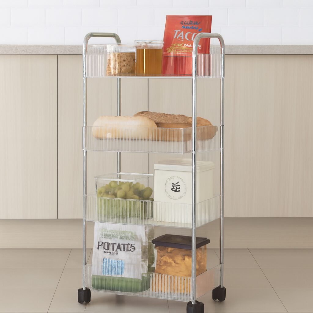עיצוב שקוף חכם: המדפים השקופים מאפשרים לראות בדיוק מה מונח בכל סלסלה ומונעים תחושת עומס ויזואלי בחלל.
