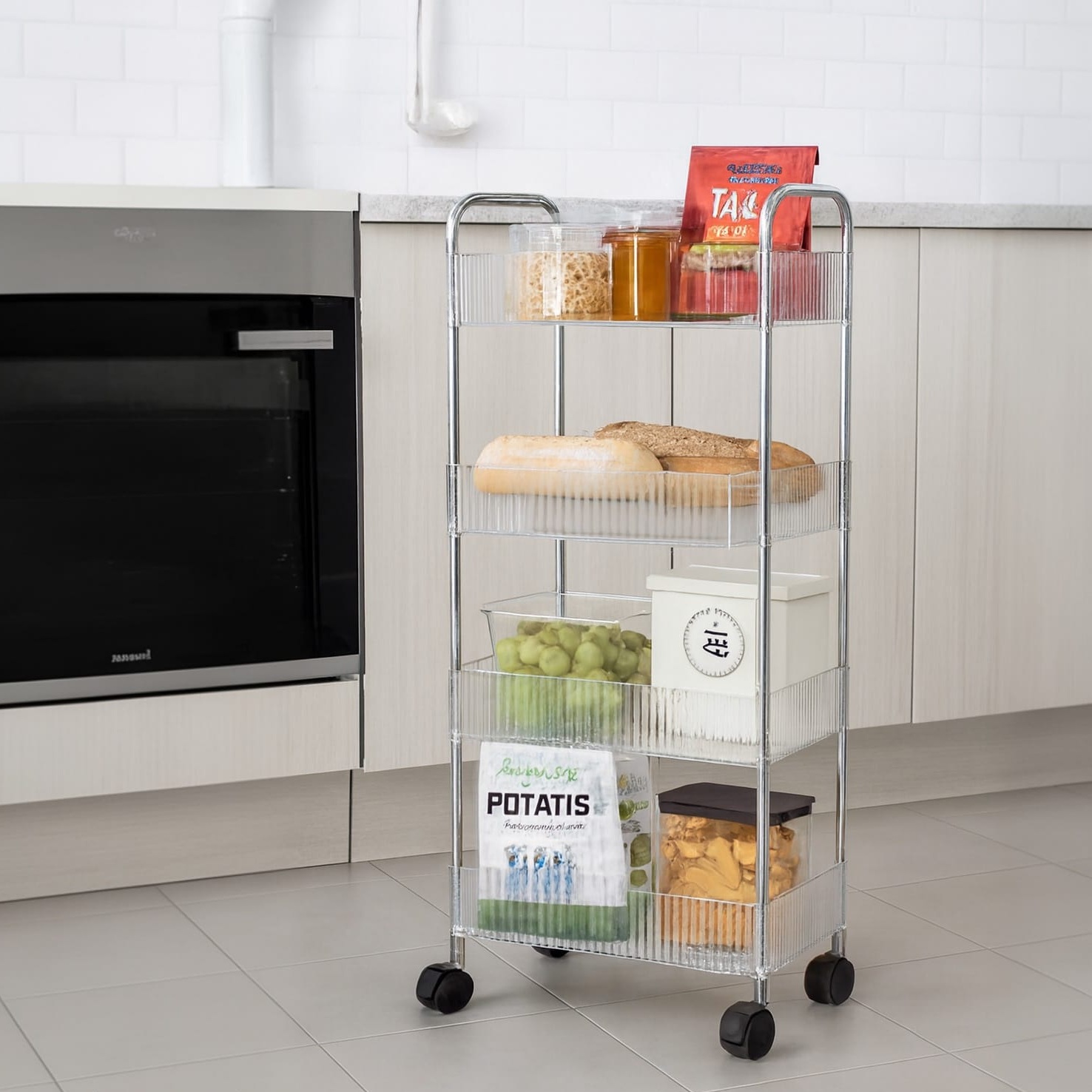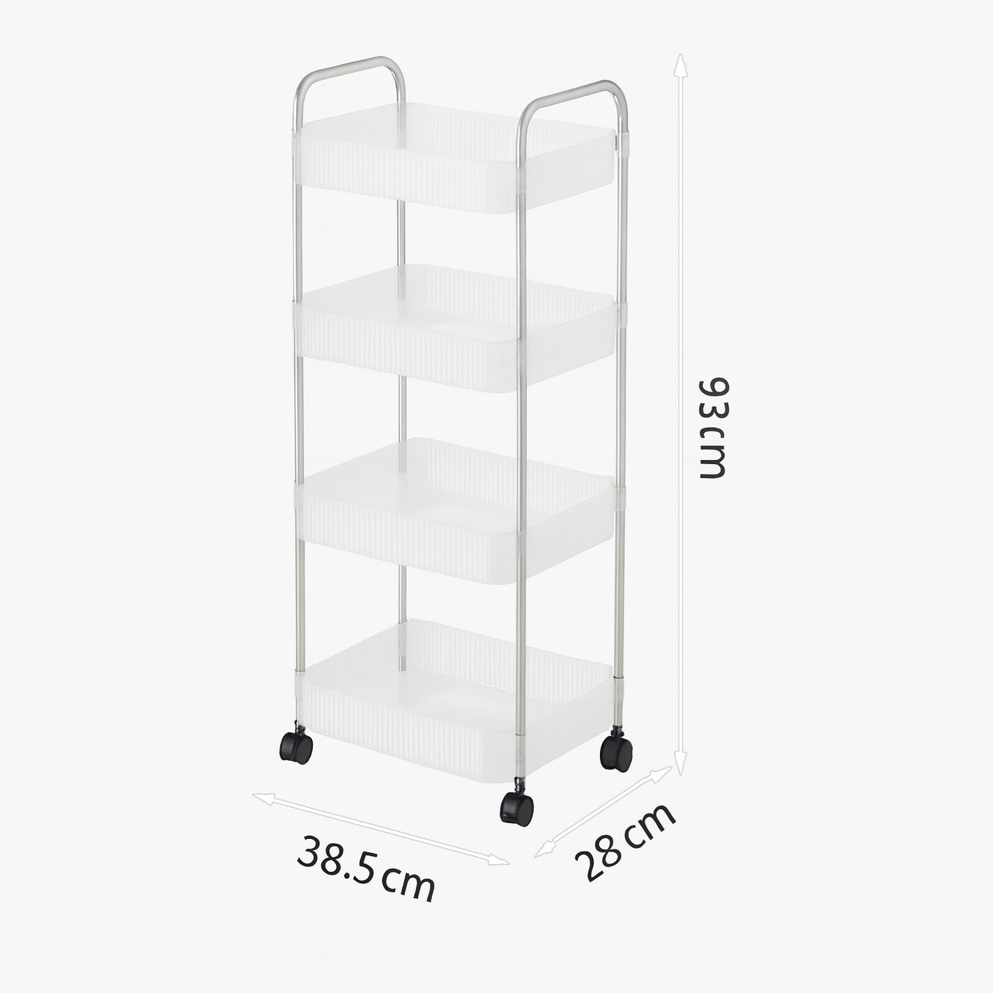 מקסימום אחסון לגובה: 4 קומות של סלסלות עמוקות המאפשרות לאחסן בקבוקים גבוהים, מגבות, מוצרי ניקוי או מזון יבש, תוך חיסכון במקום על הרצפה (גובה 93 ס"מ!).