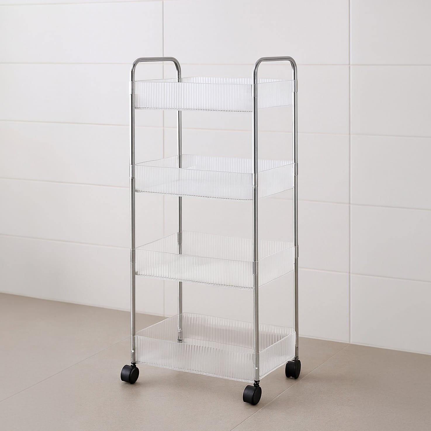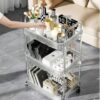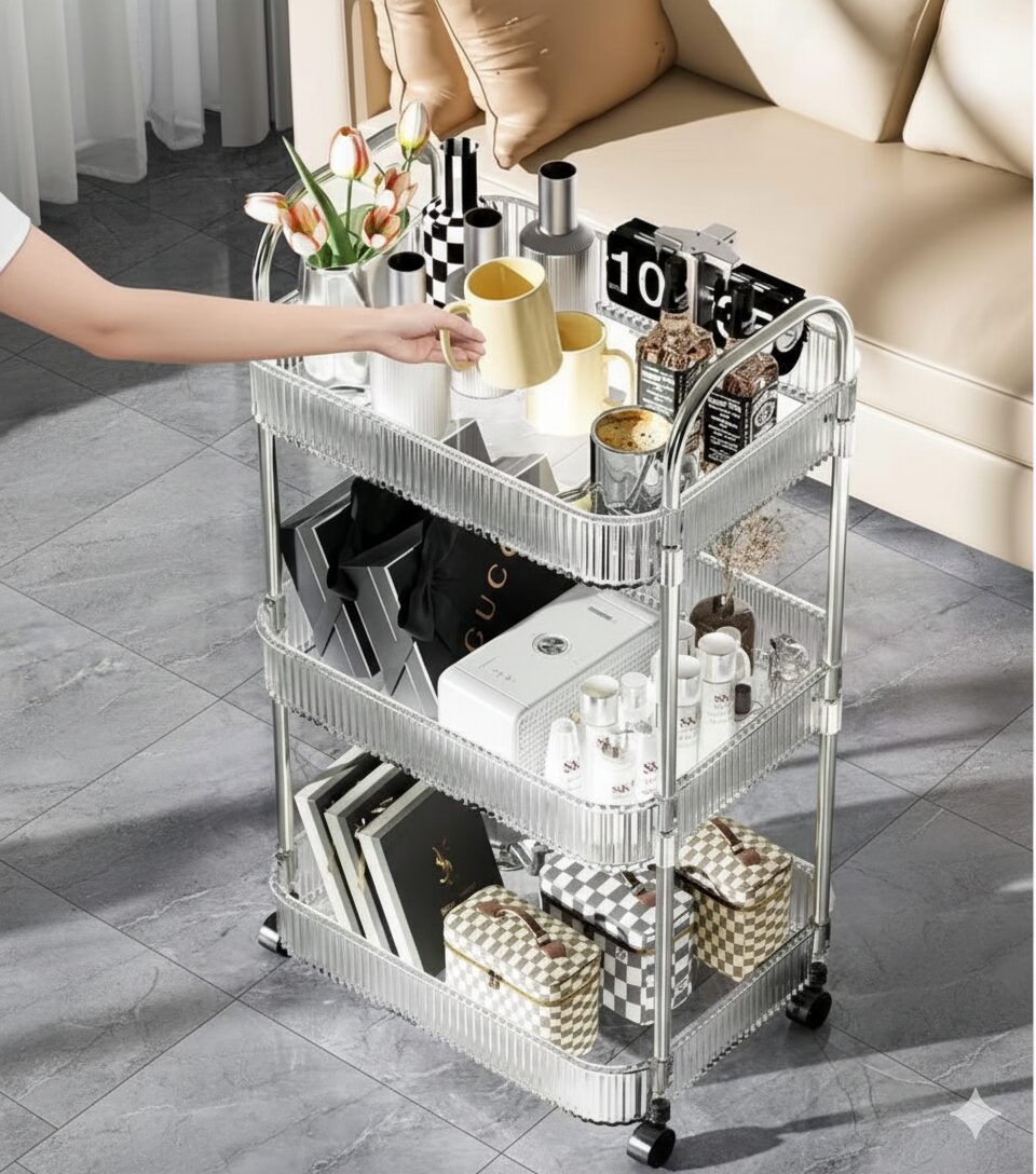 הכניסו סדר וסטייל לבית עם עגלת השירות המעוצבת שלנו. העגלה מתאפיינת במראה "מרחף" ואוורירי בזכות המדפים השקופים (בטקסטורת פסים יוקרתית) ומסגרת הכרום המבריקה. היא לא רק פריט אחסון פרקטי, אלא רהיט שמשדרג כל פינה בחדר.