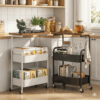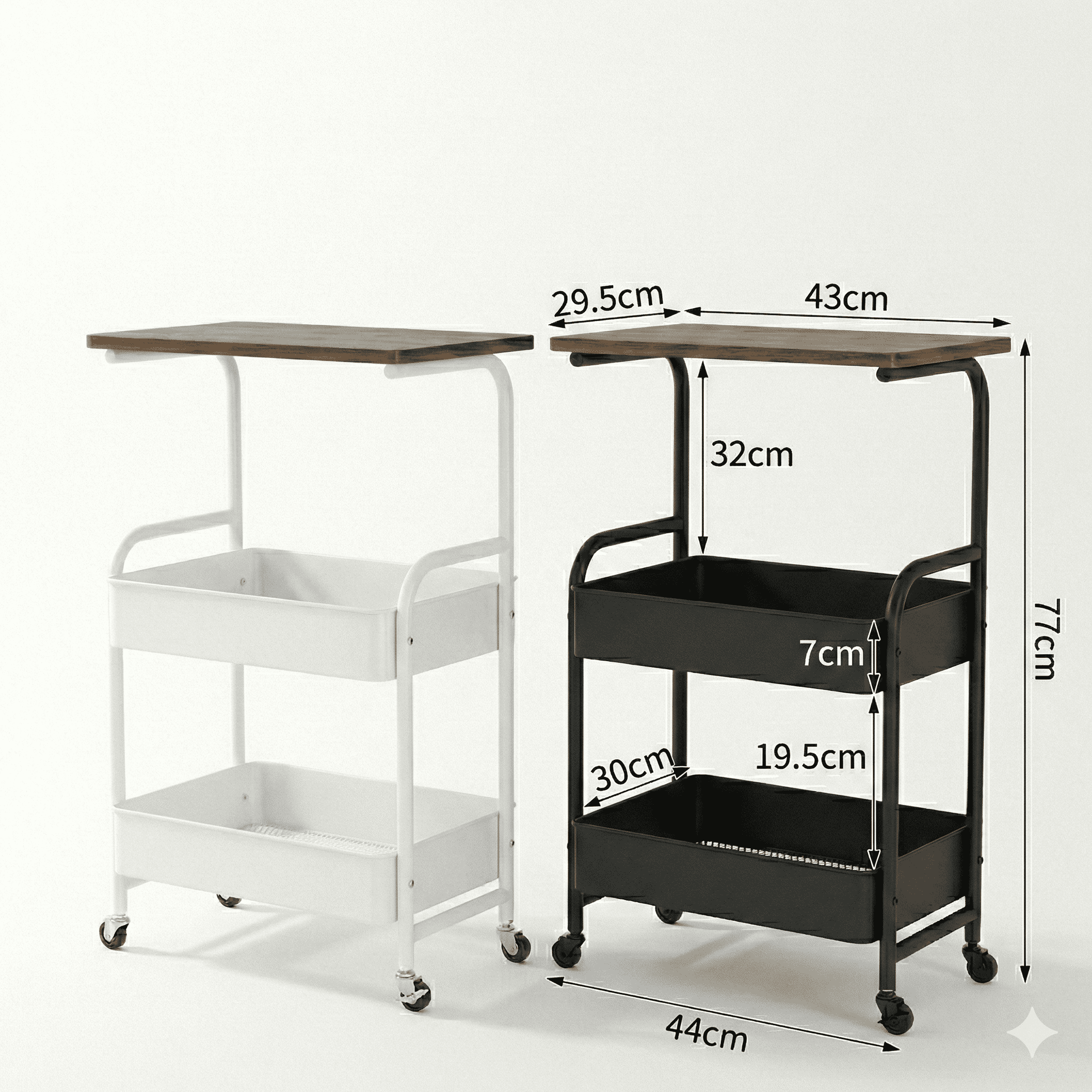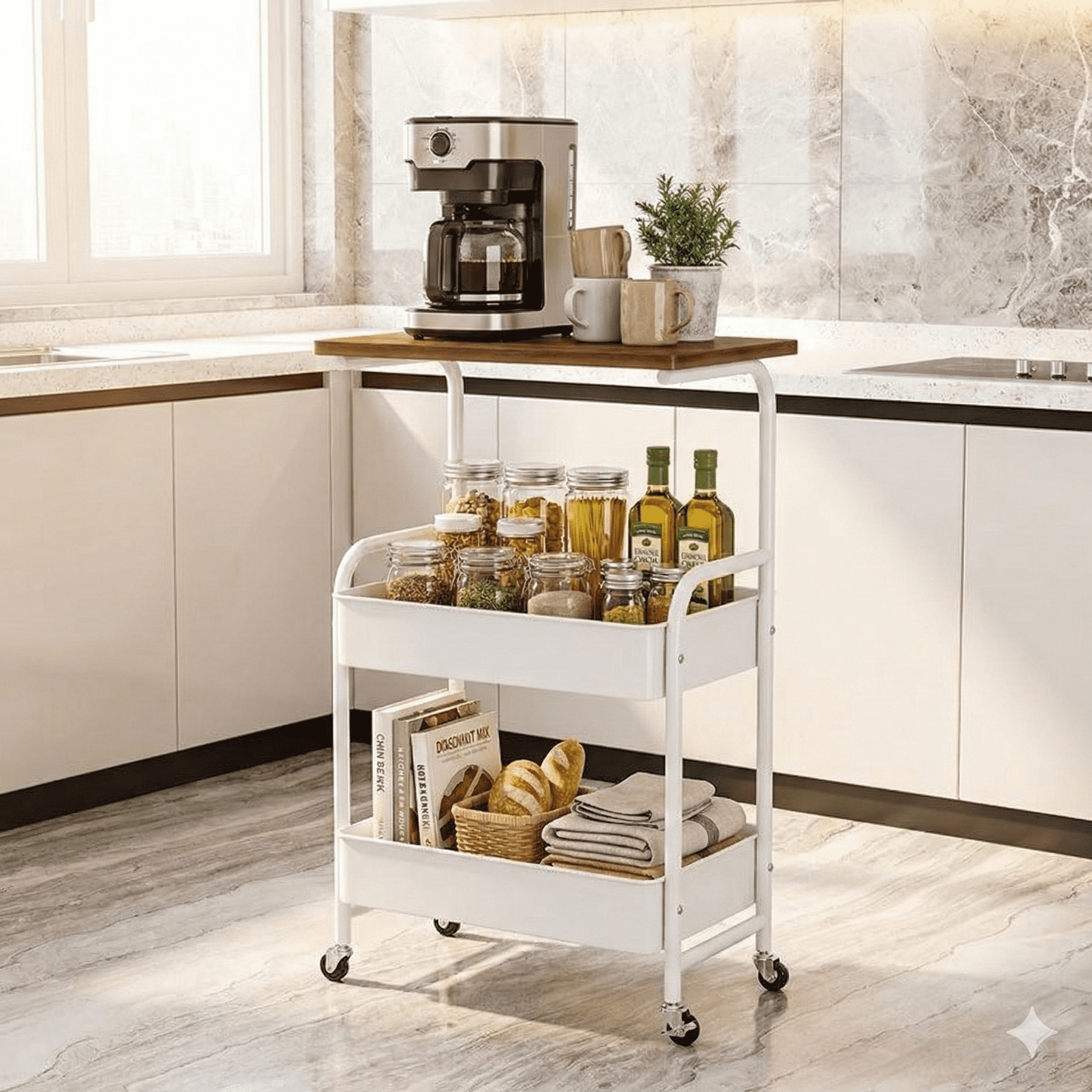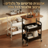 העגלה כוללת משטח עליון דמוי עץ רחב המעניק מראה חמים ויוקרתי, ומתחתיו שני סלי רשת עמידים המאפשרים אוורור מקסימלי (אידיאלי לאחסון פירות, ירקות או מוצרי טואלטיקה). בזכות גלגלי ה-360° השקטים, תוכלו להעביר אותה ממקום למקום ללא מאמץ, ולנעול אותה בבטחה בעזרת המעצורים המובנים.