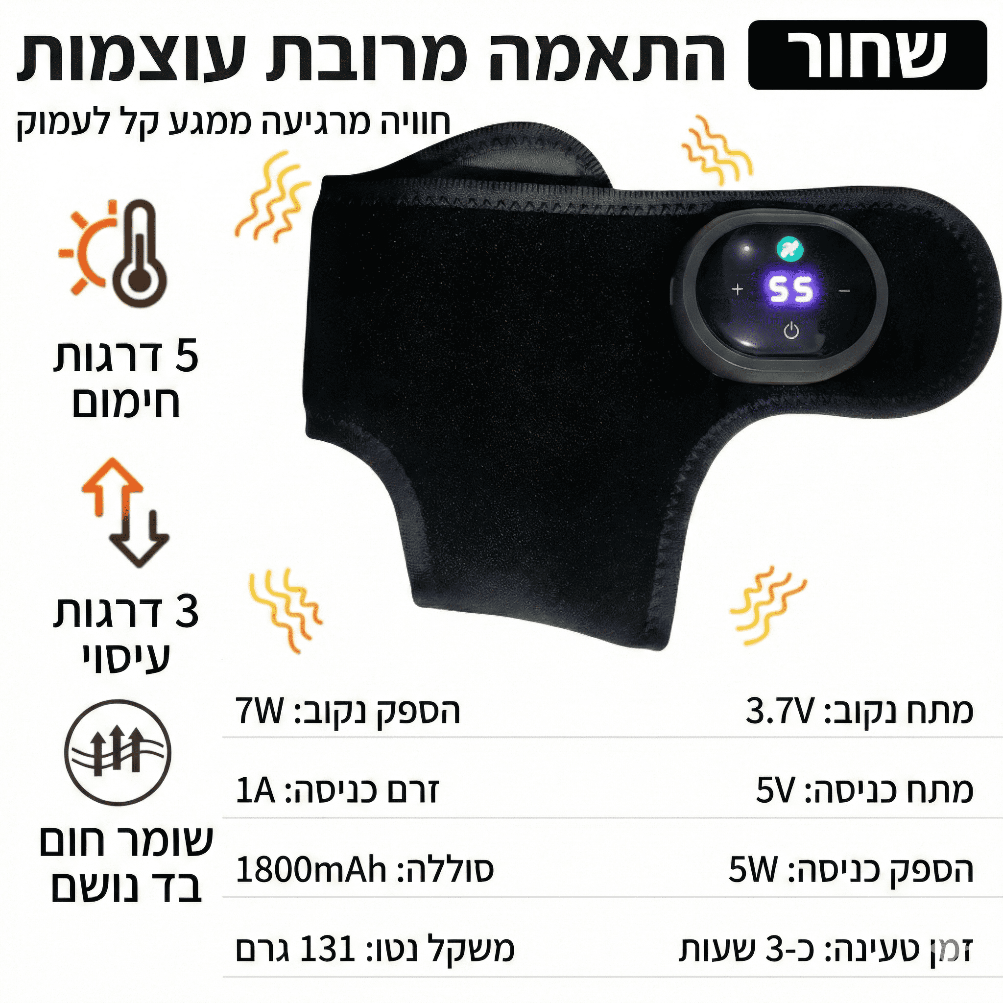 טיפול תרמי מתקדם (5 דרגות חום): שליטה מלאה בטמפרטורה בטווח של 40°C עד 60°C. החום חודר לעומק הרקמות ומסייע בשיכוך כאבים כרוניים או אקוטיים.