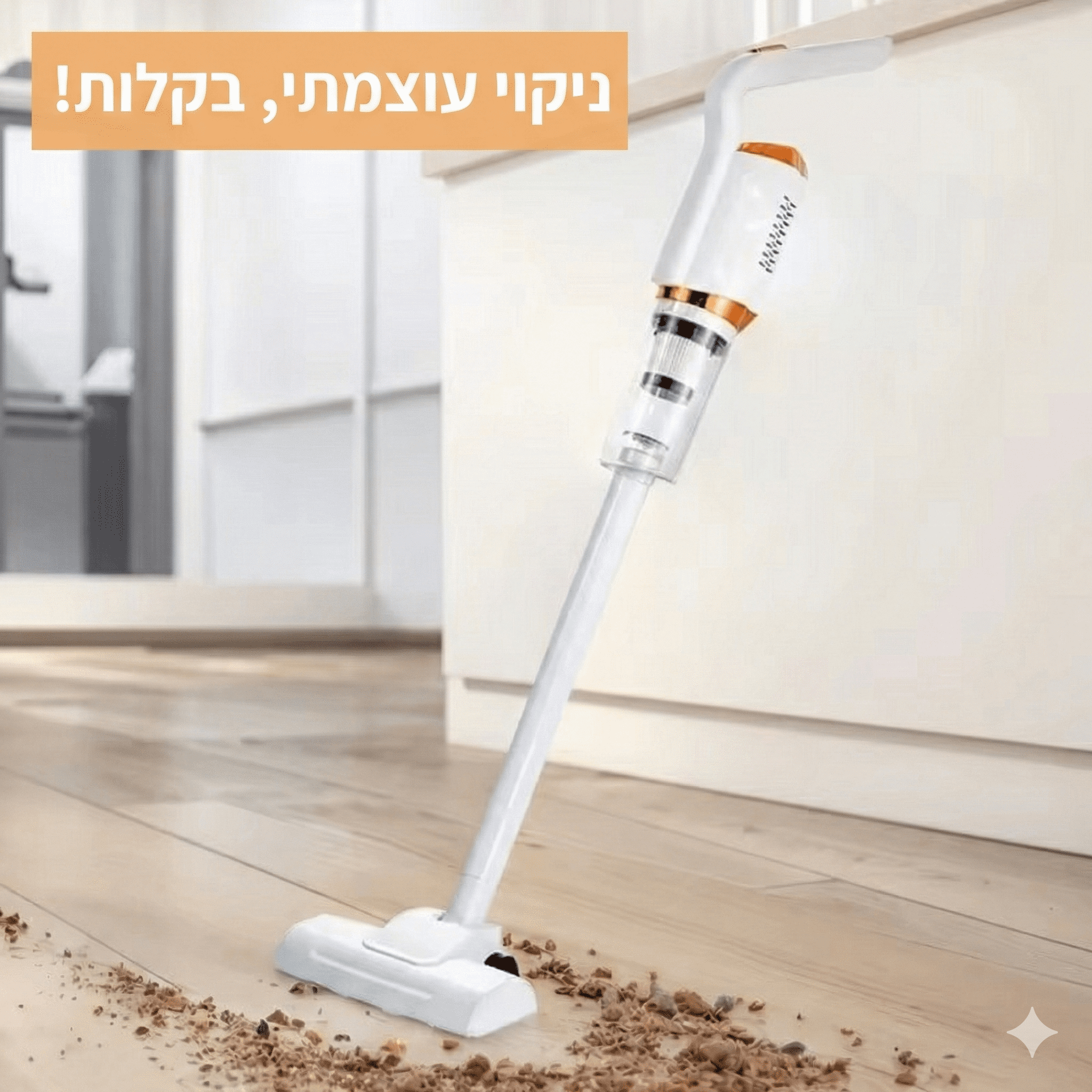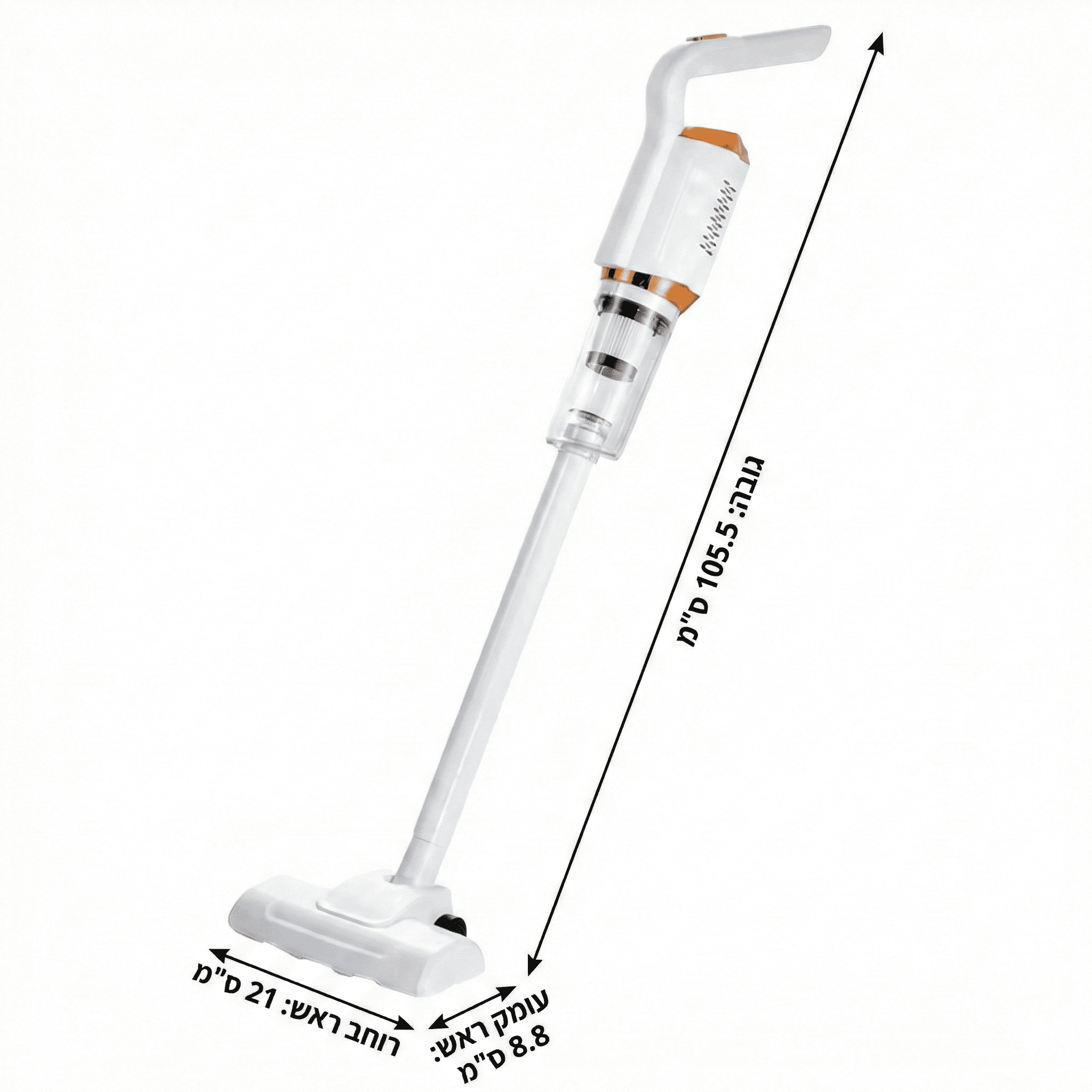 שואב אבק אלחוטי קומפקטי ונוח לניקיון יומיומי: מנוע 120W, עוצמת שאיבה 8500Pa וסוללה 2000mAh. מושלם לרצפה, פרקט, קרמיקה ופינות בבית. גובה כ-105.5 ס״מ, ראש ניקוי רחב (כ-21 ס״מ).