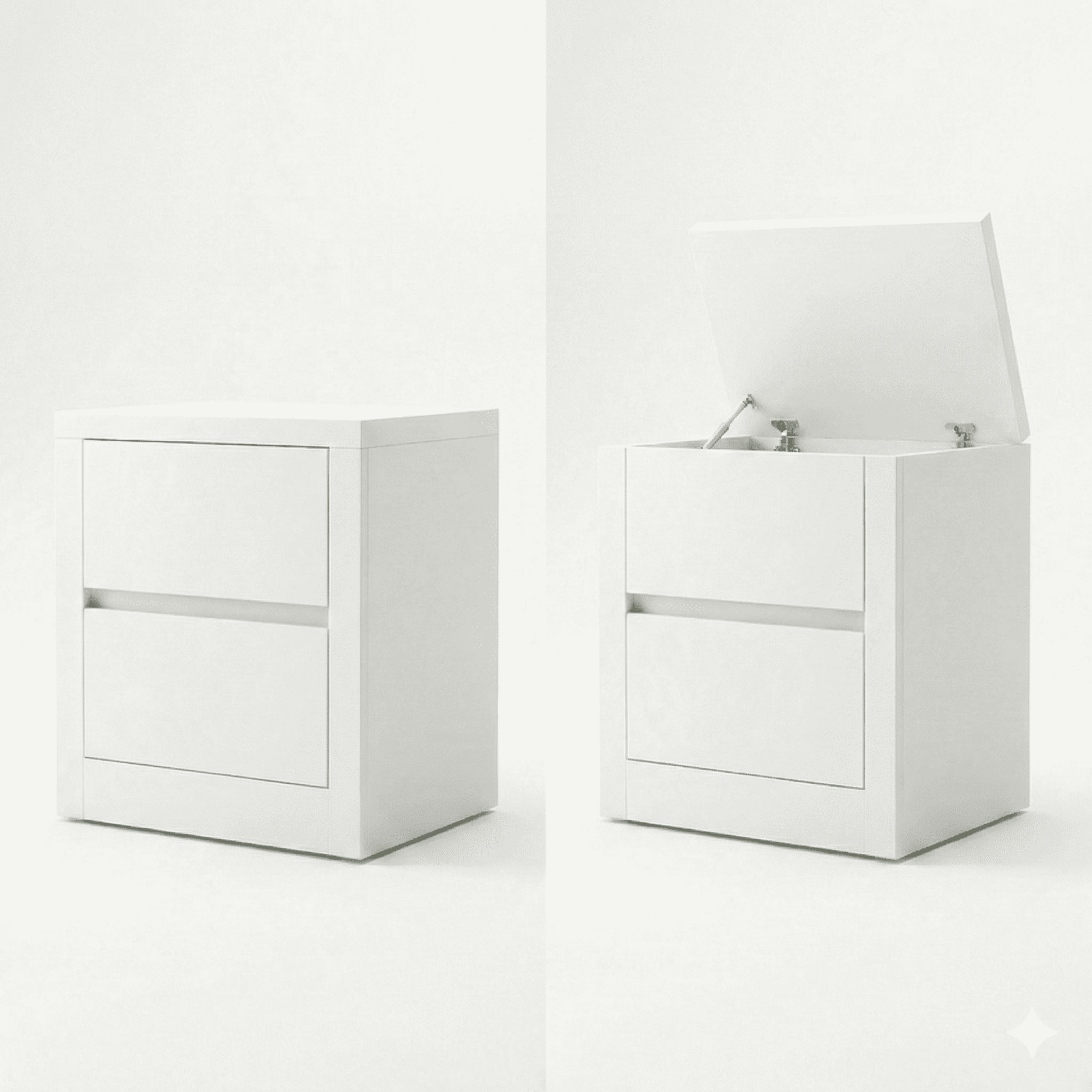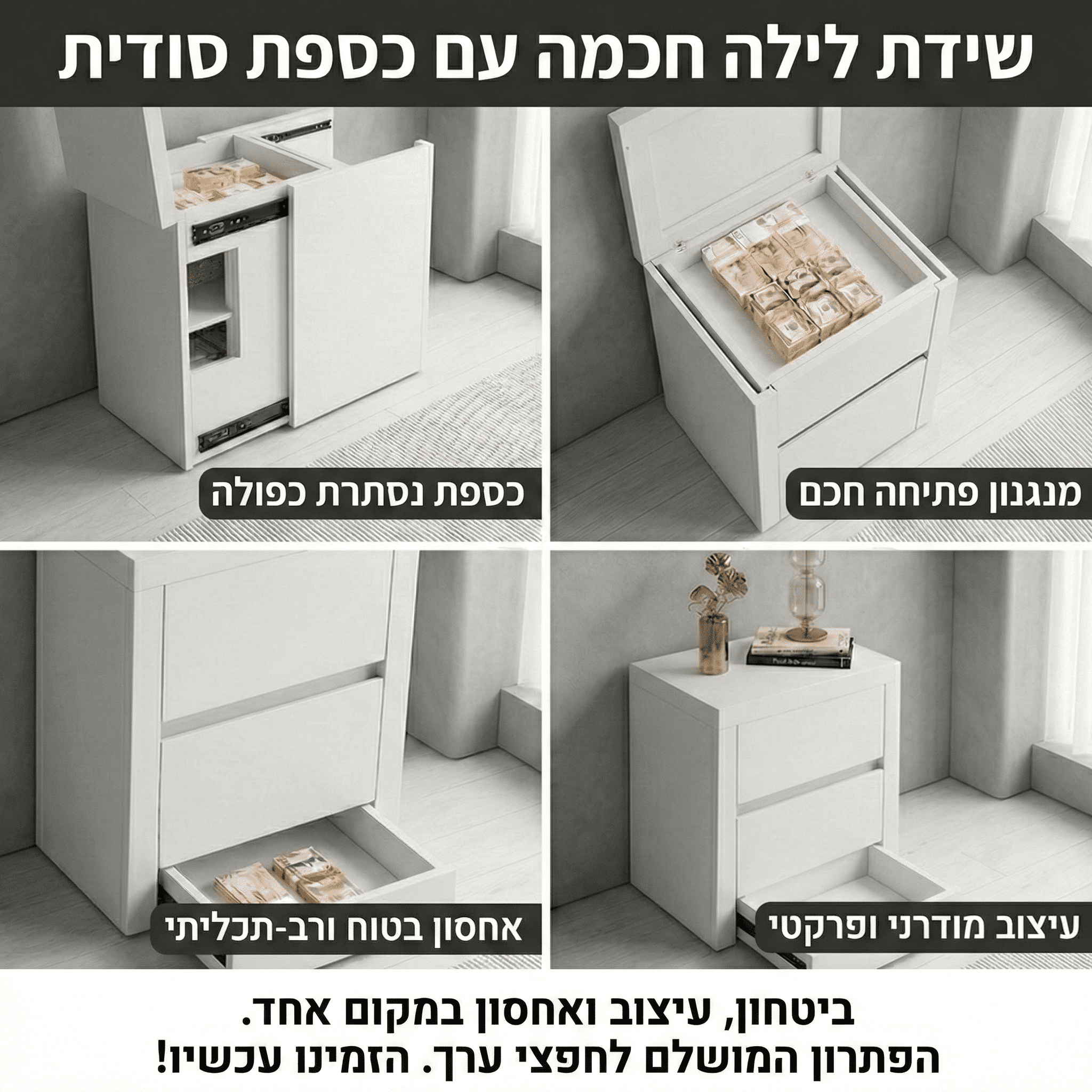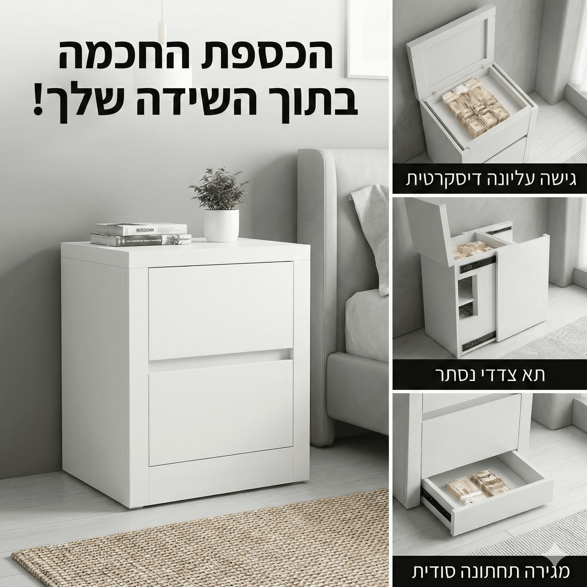 מחפשים פתרון אחסון אלגנטי שמשלב עיצוב נקי עם פונקציונליות חכמה? שידת הלילה הלבנה שלנו מציעה מראה מודרני ומינימליסטי לצד מערכת תאים נסתרים שמוסיפה שכבת סדר ודיסקרטיות – מושלם לפריטים קטנים שתרצו לשמור בהישג יד אך לא גלויים לעין.