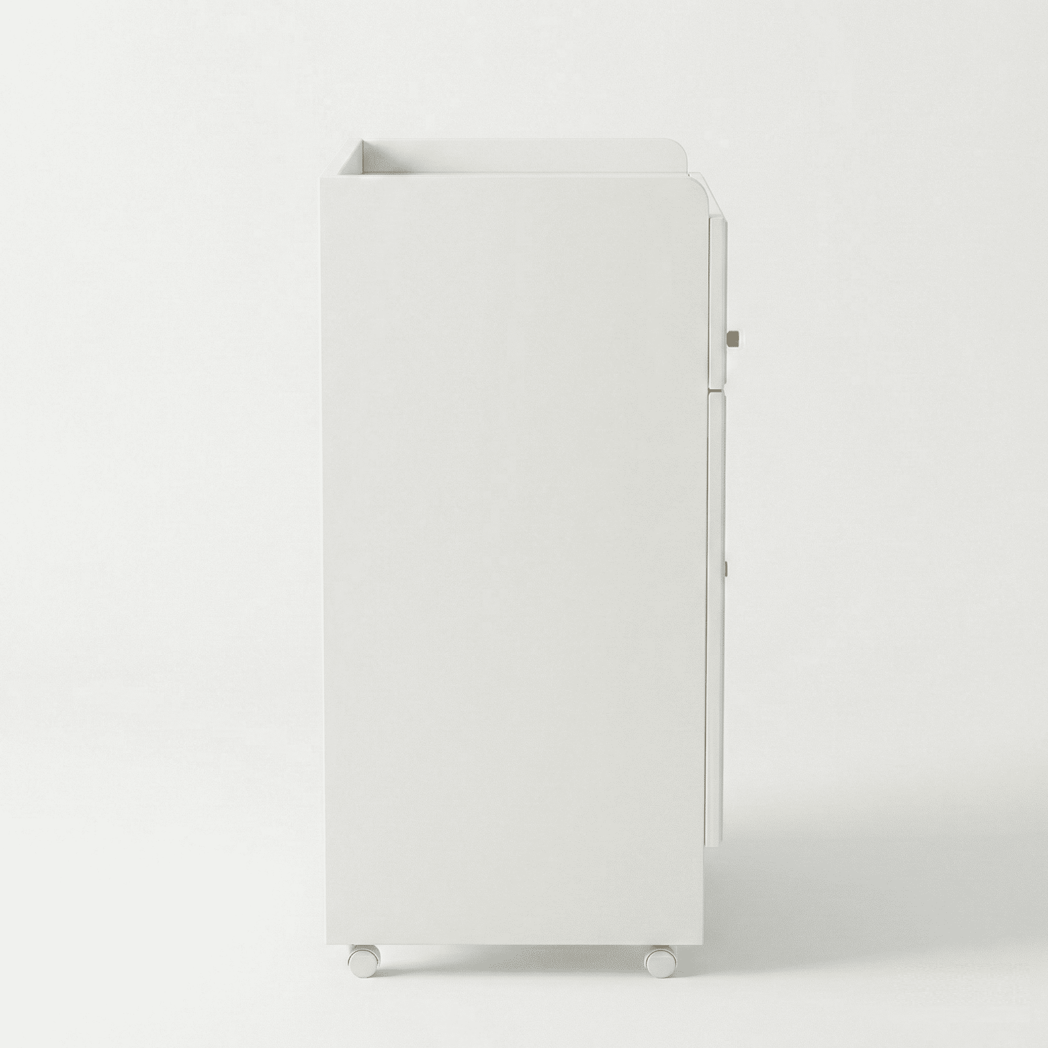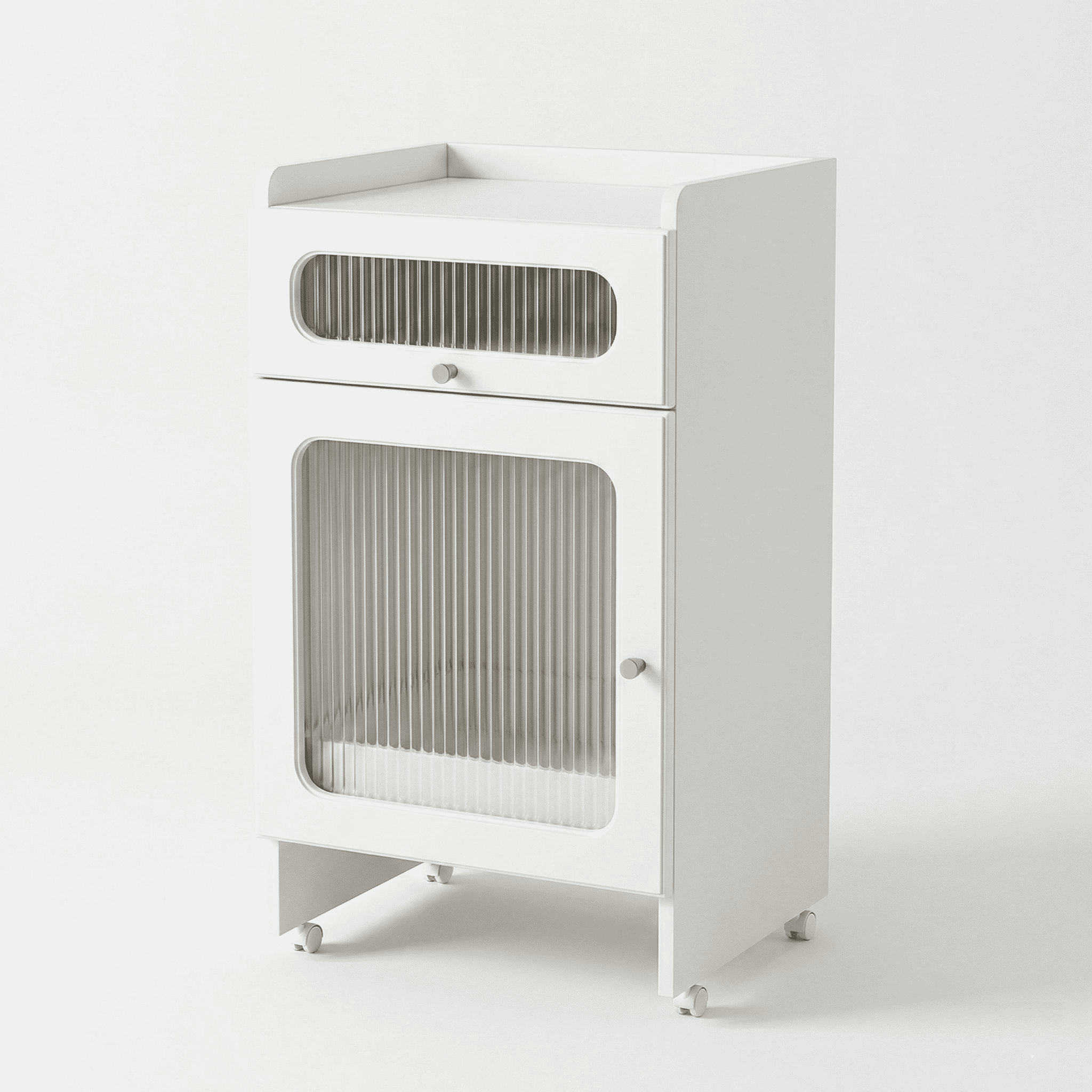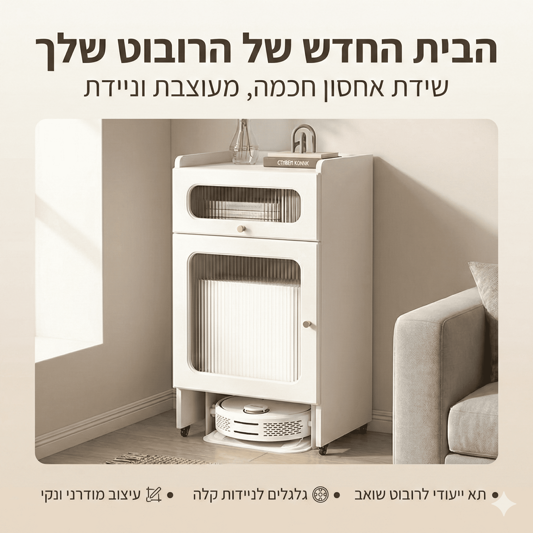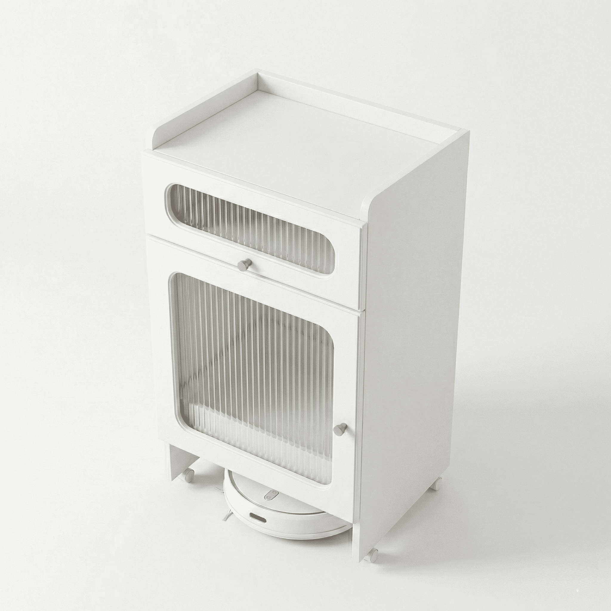 מחפשים פתרון אחסון לשואב הרובוטי? הכירו את השידה שתשדרג לכם את הבית. עיצוב מודרני עם זכוכית גלית, מגירת אחסון, משטח עליון עמיד וגלגלים לשינוע קל. הפתרון המושלם לניצול מקום חכם!