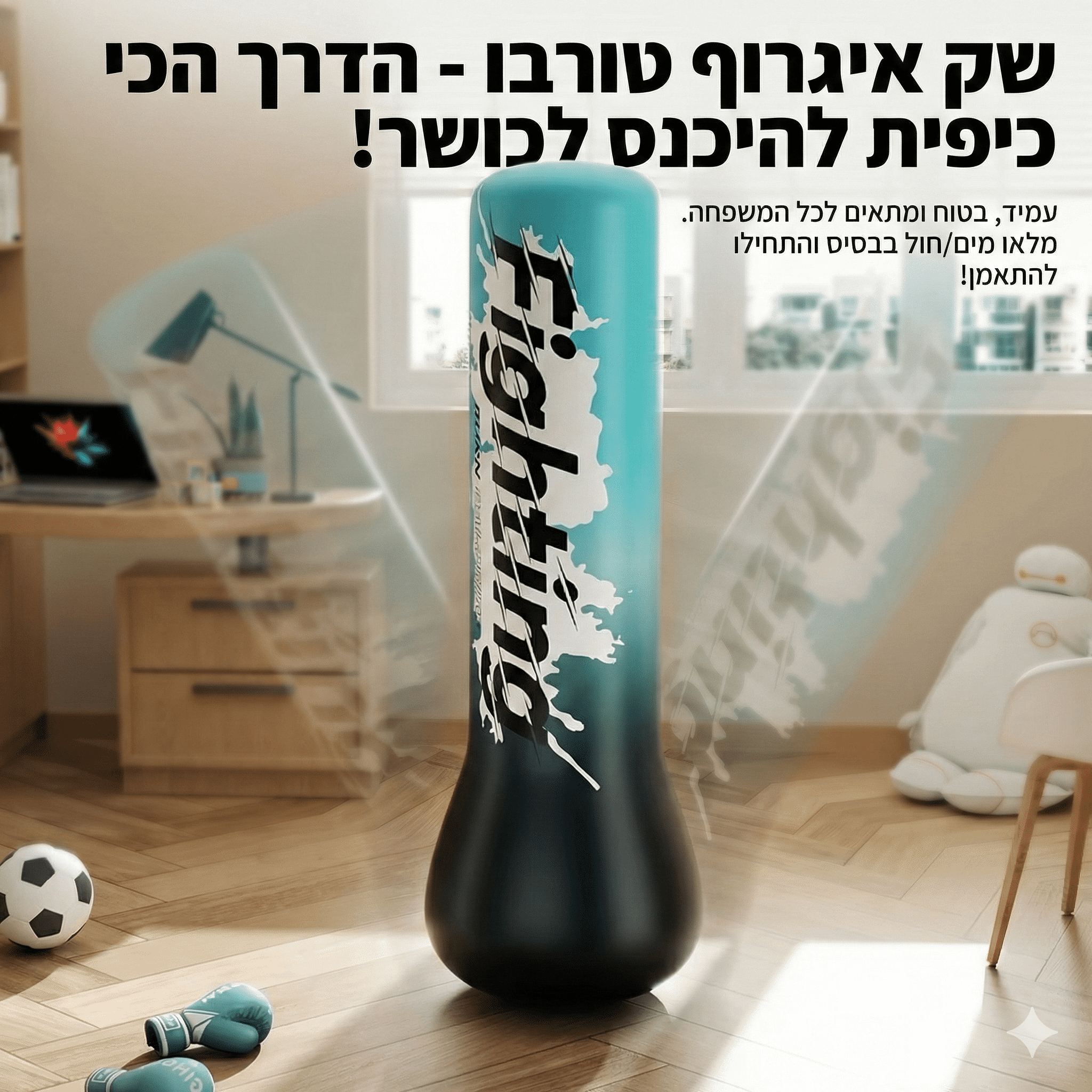 עמוד אגרוף מתנפח עומד לאימון בבית – מושלם לילדים ולמבוגרים. שסתום אטום למניעת דליפות, בסיס יציב, התקנה מהירה ונוחות שימוש. מתאים לאיגרוף, קיקבוקס ושריפת אנרגיה בסלון/חדר.