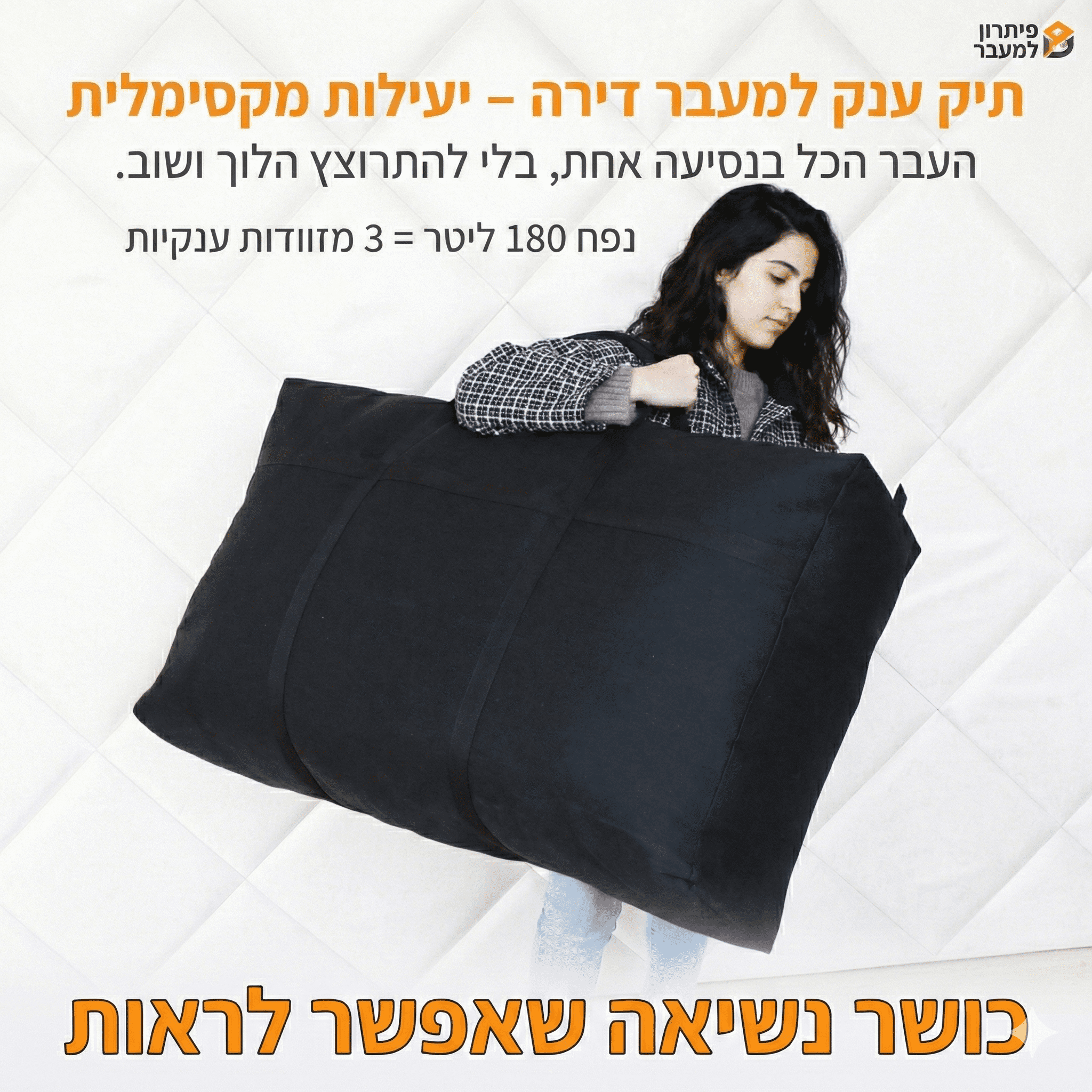 קיבולת מטורפת (180 ליטר): התיק הזה הוא תחליף ישיר ל-3 מזוודות גדולות או מספר רב של ארגזי קרטון. המבנה המלבני והגמיש שלו מאפשר דחיסה יעילה של בגדים, שמיכות פוך, כריות ומעילים.