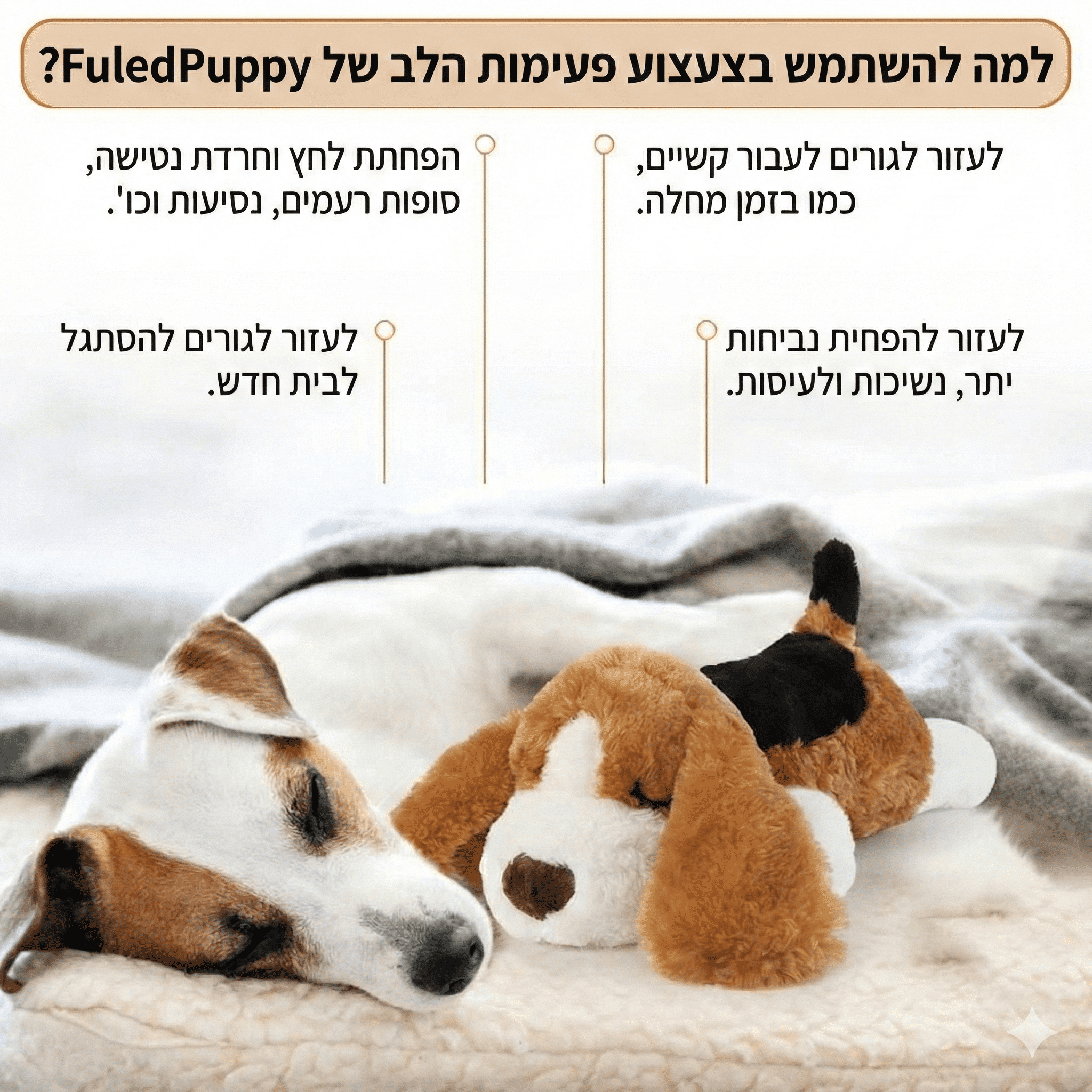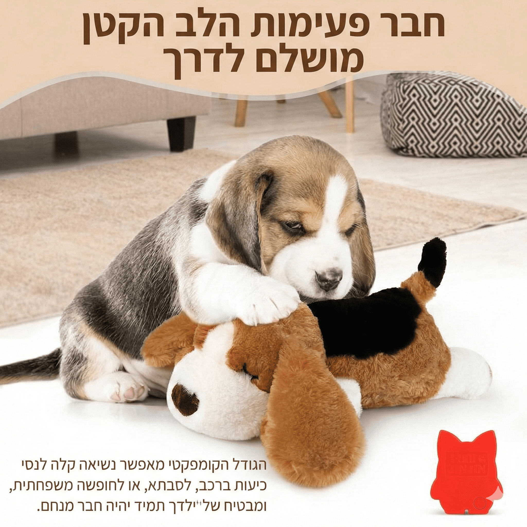 המעבר לבית חדש, לילות בודדים או רעשים חזקים יכולים להיות חוויה מפחידה עבור חיית המחמד שלכם. בובת הרגעה לכלב עם מנגנון הדופק היא הפתרון הטבעי והיעיל ביותר להפחתת סטרס. היא פותחה במיוחד כדי לחקות את הקרבה הפיזית לאמא וללהקה, ומעניקה לגור תחושת ביטחון מידית המפחיתה יללות ונדודי שינה.