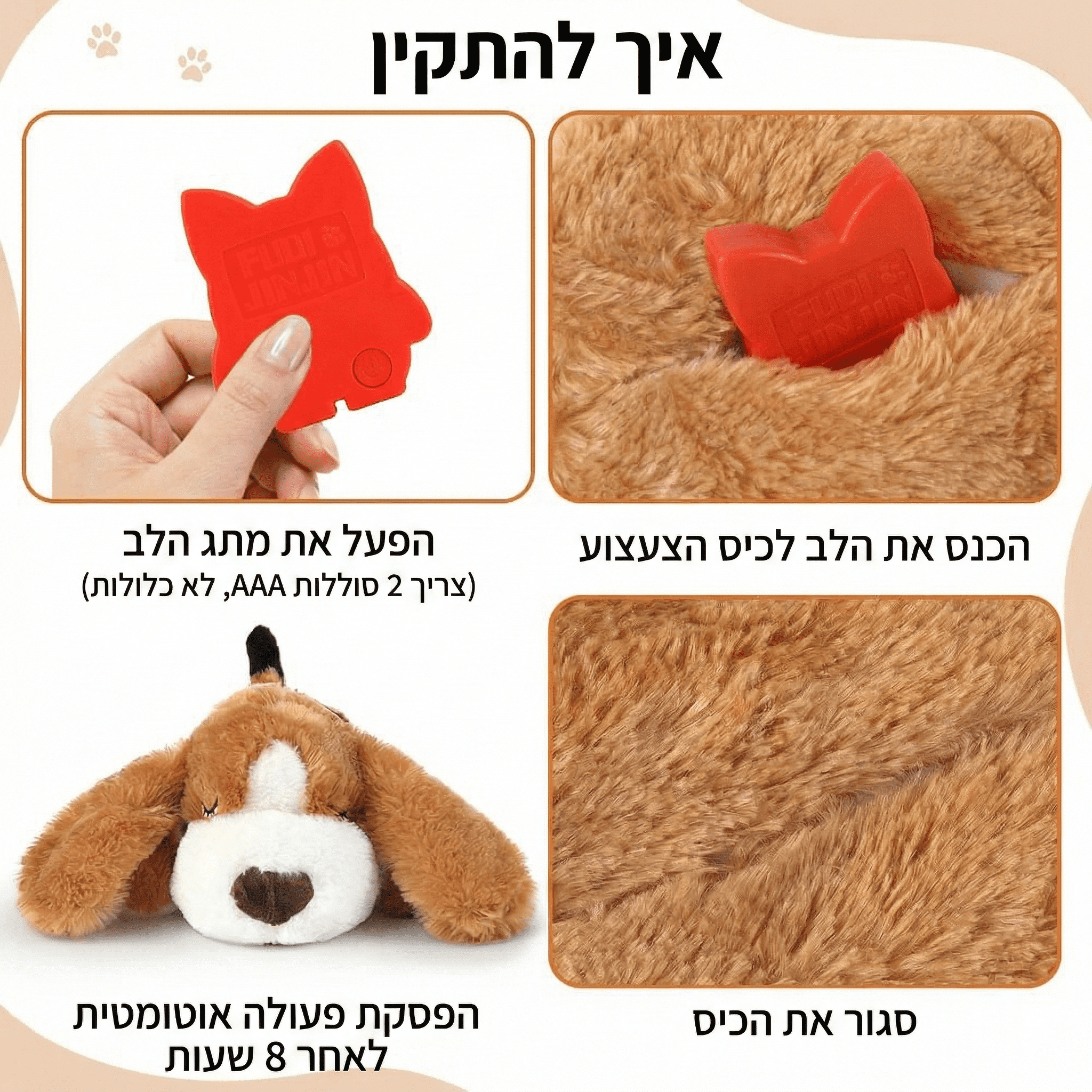 מנגנון חכם וחסכוני: מנגנון הדופק פועל ברציפות ל-8 שעות ונכבה אוטומטית. אין צורך לקום בלילה – הוא ילווה את הכלב לשינה מלאה.